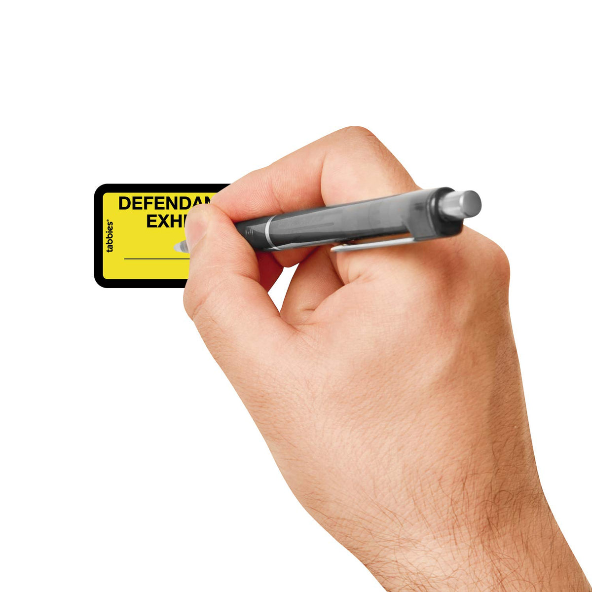 Q: What color are the Tabbies Legal Exhibit Labels and how does it affect visibility?A: The labels are yellow, providing high visibility which helps in quickly identifying and locating labeled documents in a stack or folder.