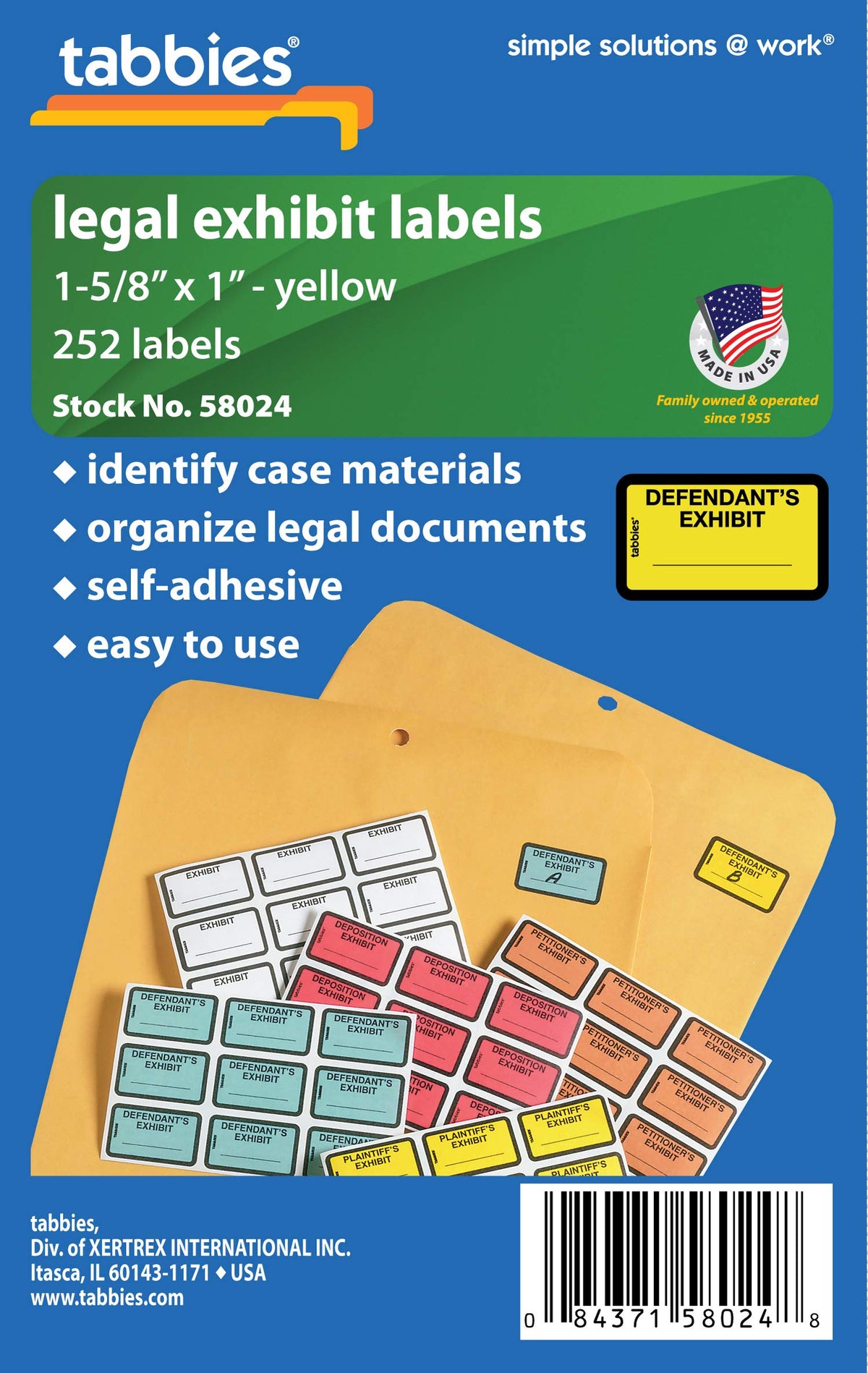 Q: What are Tabbies Legal Exhibit Labels used for?A: Tabbies Legal Exhibit Labels are specifically designed for labeling legal documents and exhibits, making them essential for attorneys, legal professionals, and court presentations.