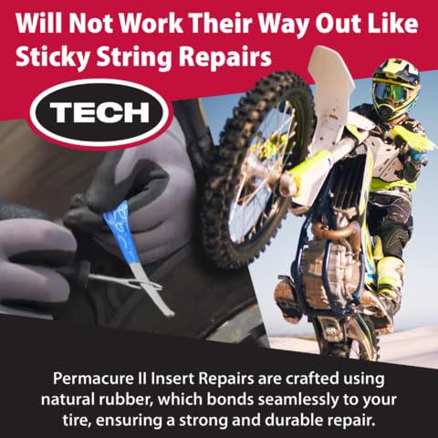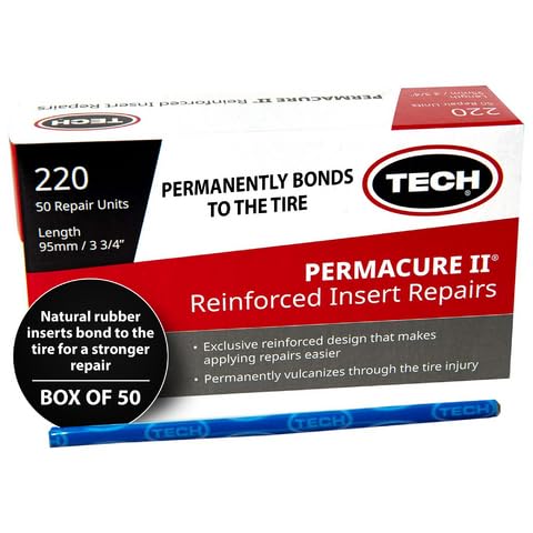 'TECH Tire Repairs Permacure II Reinforced Insert Repairs offer a reliable, long-lasting solution to tire damage. Designed for non-highway vehicles, these tire plugs provide a permanent repair, combining durability with innovation. The unique cushion gum technology flows into tire cracks and crevices, ensuring a robust vulcanization that permanently bonds the repair to the tire, restoring it to its original condition.Whether you're dealing with a flat tire or preparing for potential issues, Permacure II is the solution you need. These heavy-duty tire plugs are reinforced with nylon for easy installation and unparalleled strength. Unlike basic tire plugs, these provide a professional-grade fix suitable for a wide range of vehicles, from cars to UTVs, making them an essential part of any tire repair kit.For those who travel often or live in areas with frequent road hazards, a reliable tire repair kit is essential. Permacure II inserts offer a quick, temporary solution for flat tires, but when combined with TECH Flow-Seal Vulcanizing Fluid, they provide a permanent repair for off-road vehicle tires. The chemical bonding process ensures the repair integrates with the tires structure, making it as good as new.These versatile plugs are compatible with various vehicles, including ATVs, lawn mowers, and other specialized tires. When paired with TECH tire repair kits, they offer a customizable solution for tire maintenance. Whether you're dealing with a puncture or sidewall tear, Permacure II plugs deliver the performance and reliability you need.With TECH Tire Repairs Permacure II inserts, youre always prepared for any situation-on or off the road. Don't settle for less when it comes to tire safety-choose the trusted solution used by professionals worldwide.''