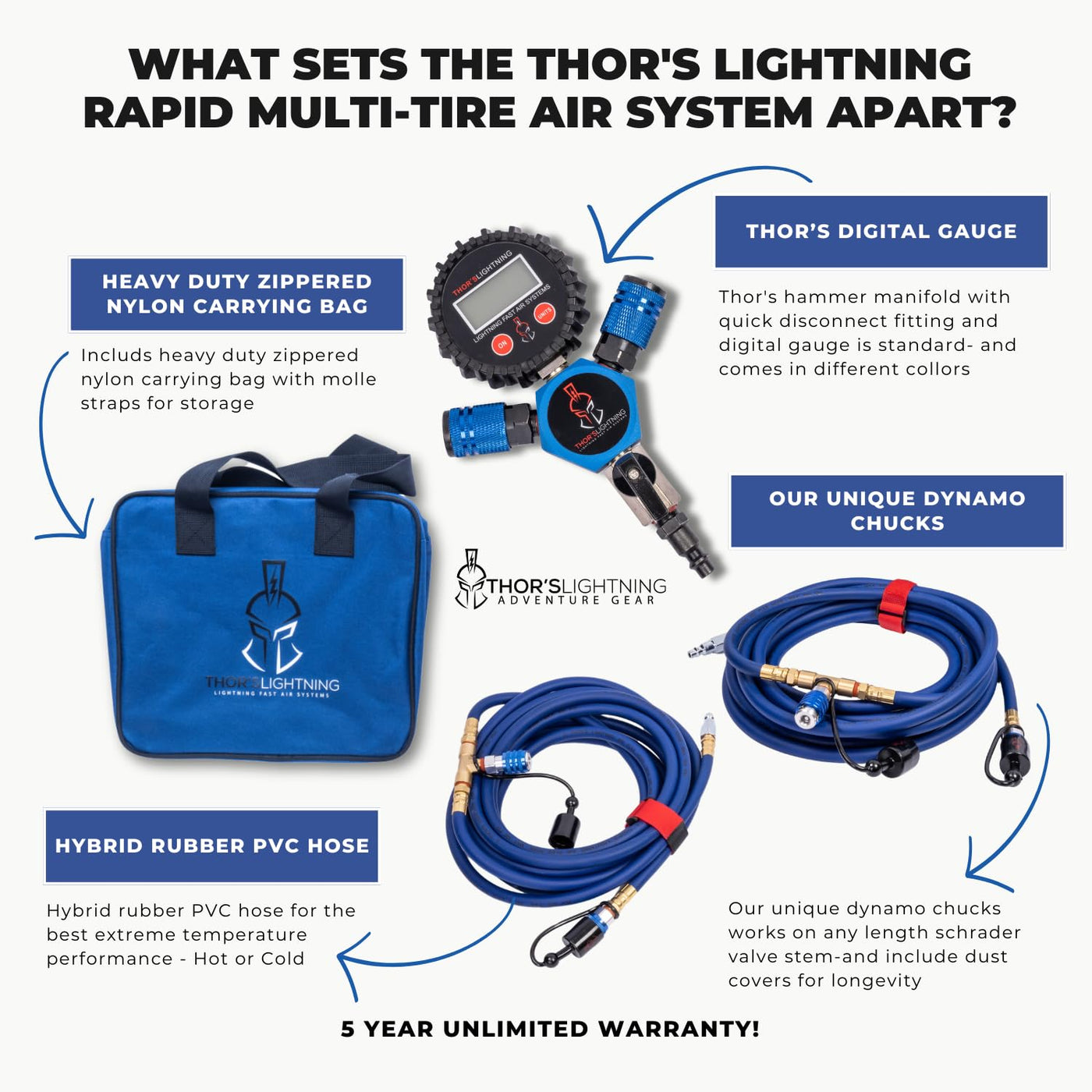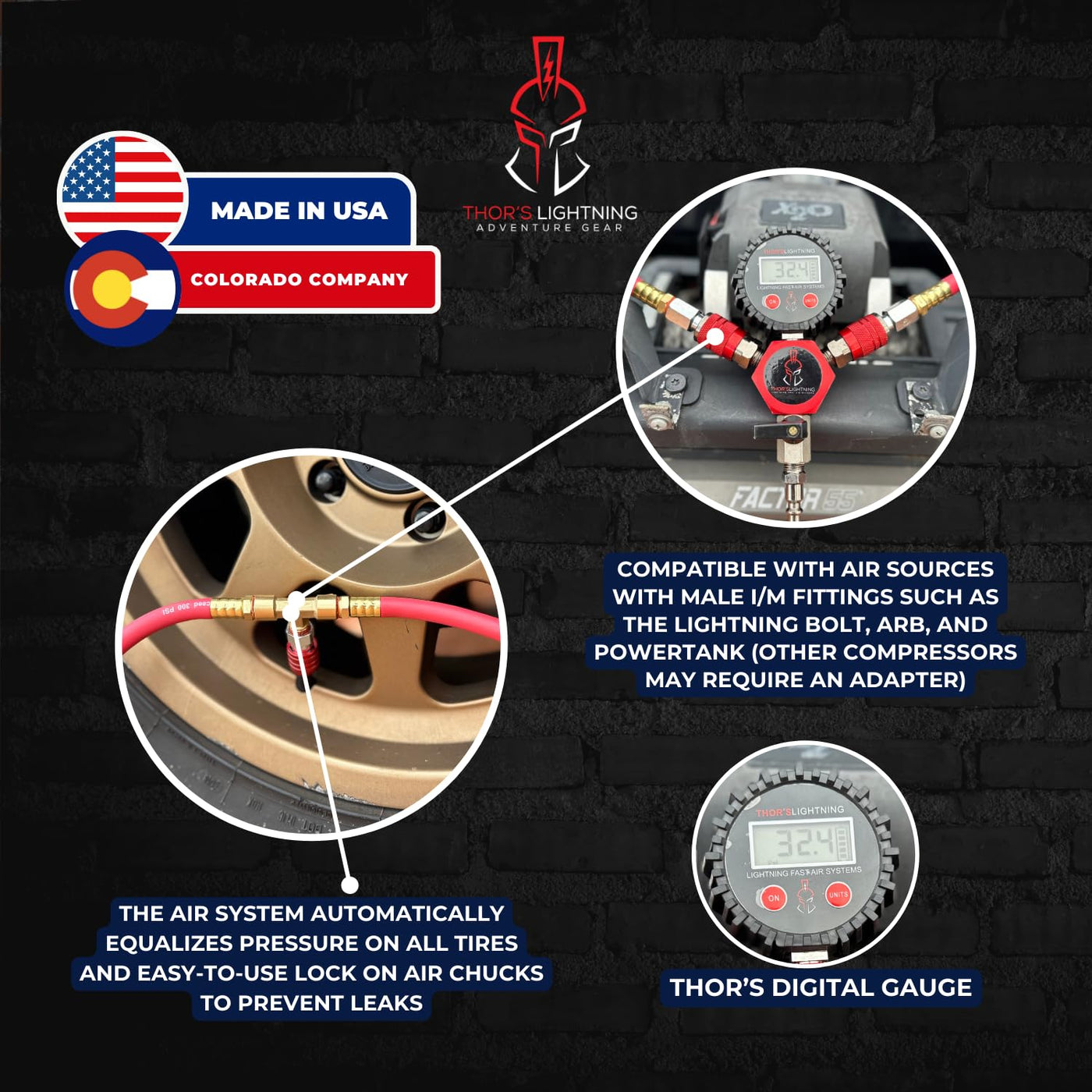The Thor'S Lightning Air System Is The Fastest Multi-Tire Air System On The Market. Air Up And Deflate All 4 Tires On Your Vehicle In Just A Few Minutes! We Use 1/4'' I.D. Hybrid Hose, High-Flow Brass Fittings, And Offer Different Air Chuck Styles To Match Your Tire Valve Stems. Our Air System Comes With A 5 Year Unlimited Warranty, And This Is From Usa Colorado Company!