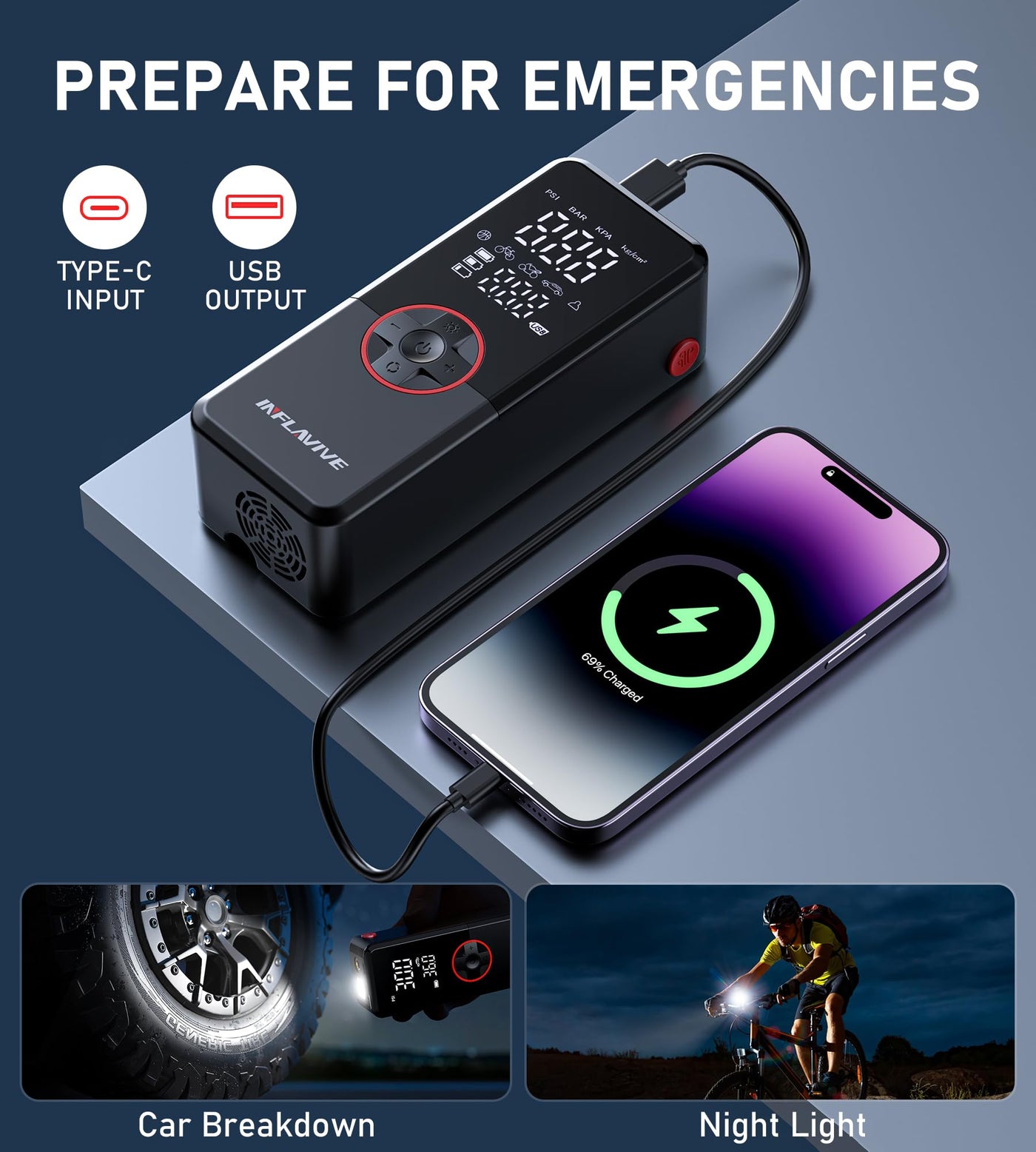 Experience unmatched convenience on your journeys with our portable tire inflator. This cordless air compressor features a powerful rechargeable battery, allowing you to inflate your car tires without the worry of running out of power. For emergencies on the road, the included 12V DC power cord ensures you always have a backup option. With a maximum pressure of 150 PSI and an impressive airflow rate of 35 L/min, this air pump can quickly inflate your car tires (30-36 PSI) in just one minute! Whether you need to pump up car, bike, or motorcycle tires, or even sports balls, this electric tire inflator makes lifes daily challenges easier and your travel adventures more enjoyable. Equipped with a high-precision chip, our air pump for car tires provides real-time pressure monitoring for accurate readings. Once the preset pressure is reached, the bike pump automatically shuts off, protecting your tires from over-inflation. This isnt just any air compressor; it also comes with built-in LED lighting, featuring SOS, normal, and flashing modes for low-light situations and emergencies. Additionally, it doubles as a portable power bank, enabling you to charge your devices anytime, anywhere. Its compact size makes it easy to carry and store, ensuring you can always have it with you during road trips, camping adventures, or everyday commutes. Our air pump for inflatables with five inflation modes tailored for cars, motorcycles, bicycles, balls, and a customizable option, you can easily select the right setting for any task. Plus, choose from four pressure units (PSI, Bar, kPa, kg/cm) to suit your needs. Dont be caught unprepared. The portable tire inflator is the perfect companion for all your travels, ensuring safety and convenience wherever the road takes you. Get yours today and enjoy peace of mind on every adventure!