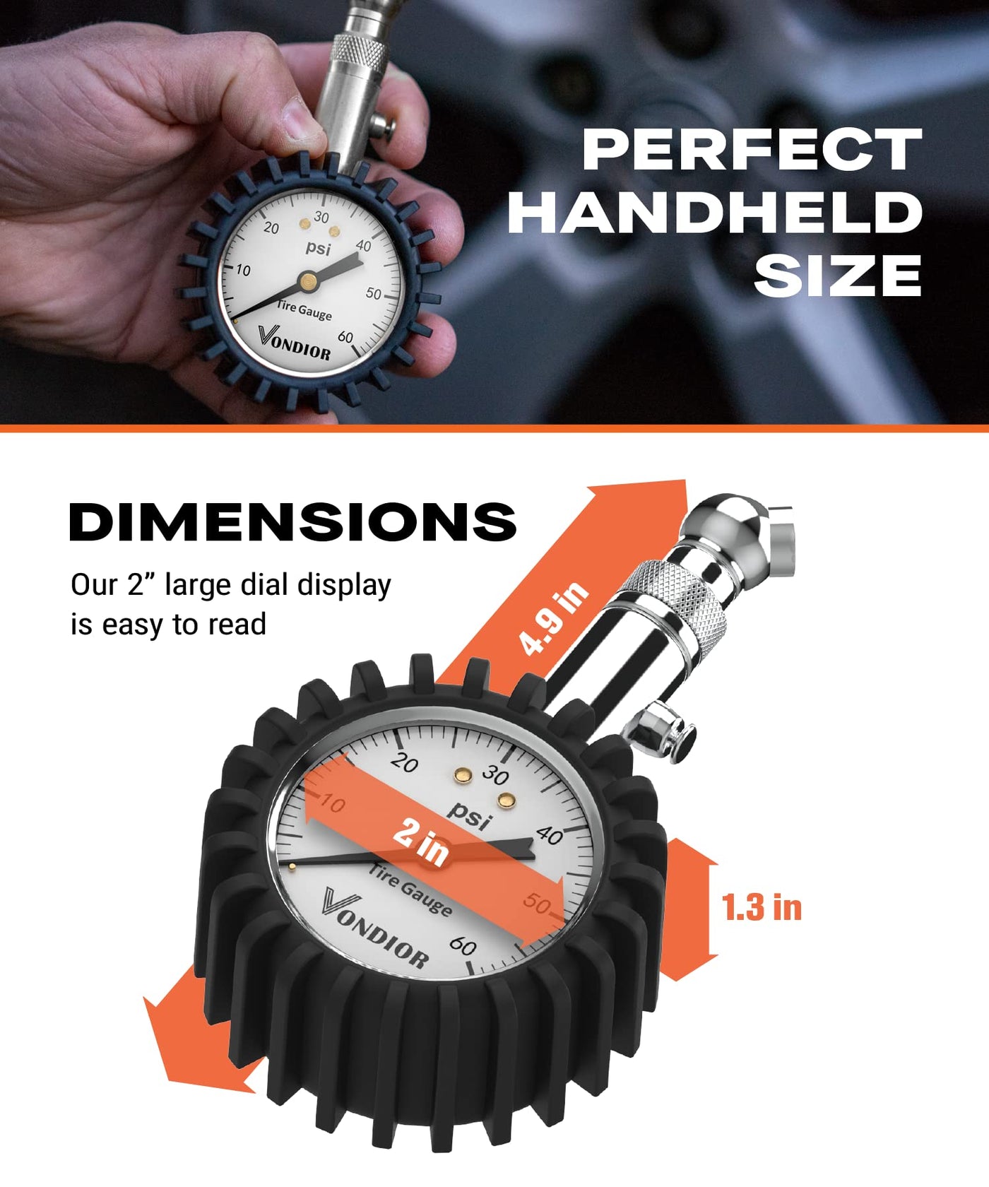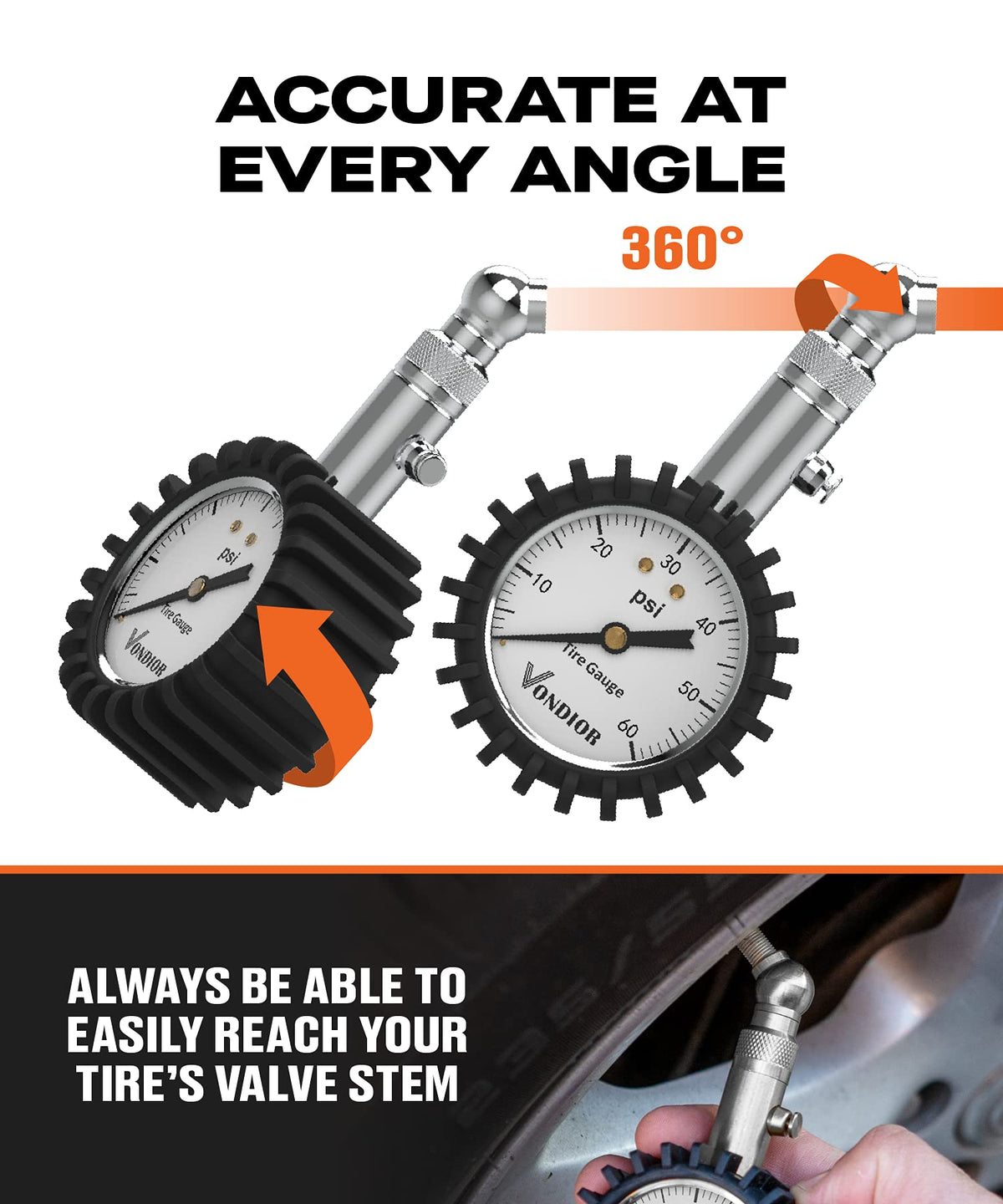 Do You Want To Cut Down On Fuel Costs? Do You Want To Improve Your Car Performance? Do You Hate Going To The Gas Station Just To Check Your Tire Pressure Or Worse, Realise The Pump Is Broken? Now, You Can Have Your Cake And Eat It Too, As It'S Actually Possible To Improve Your Car'S Handling And Reduce Gas Expenses With One Simple Check That Takes Less Than Three Seconds - Anywhere, Anytime - Without Running To The Gas Station! It'S The Vondior Tire Pressure Gauge. It Accurately Measures Your Tire Pressure With Little Effort. Just Attach It To The Tire'S Air Valve And The Exact Measurement Will Show Instantaneously. Unfortunately Most People Are Not Aware Of The Importance Of Proper Air Pressure.Poorly Inflated Tires Increase Fuel Costs And Emissions, Which May Not Sound Like Much, But It Means That The Average Person Who Drives 12,000 Miles Yearly On Under-Inflated Tires Uses About 144 Extra Gallons Of Gas, At A Cost Of $300-$500 A Year And Adds 2,880 Pounds Of Greenhouse Gases To The Environment Annually.Poorly Inflated Tires Wear Faster And Unevenly, And Negatively Impact The Vehicle'S Braking And Handling. Improving Your Car'S Performance Is Essential For Your Driving Experience. The Vondior Analog Tire Gauge Does Not Require Batteries, So It'S Ready For Use Anytime. In Addition, Its Readings Can Be Made Quickly, Be Visible At Night And Accurately Without Having To Stand At The Gauge Waiting For The Reading To Stabilize, As With Digital Gauges.Protected By A Rubber Shield, It'S Durable And Made To Last Under All Weather Condition. Order Now Our Customer Service Is Here For You 24/7 For Anything You Need! And Your Pressure Gauges Are Covered By 3 Years!