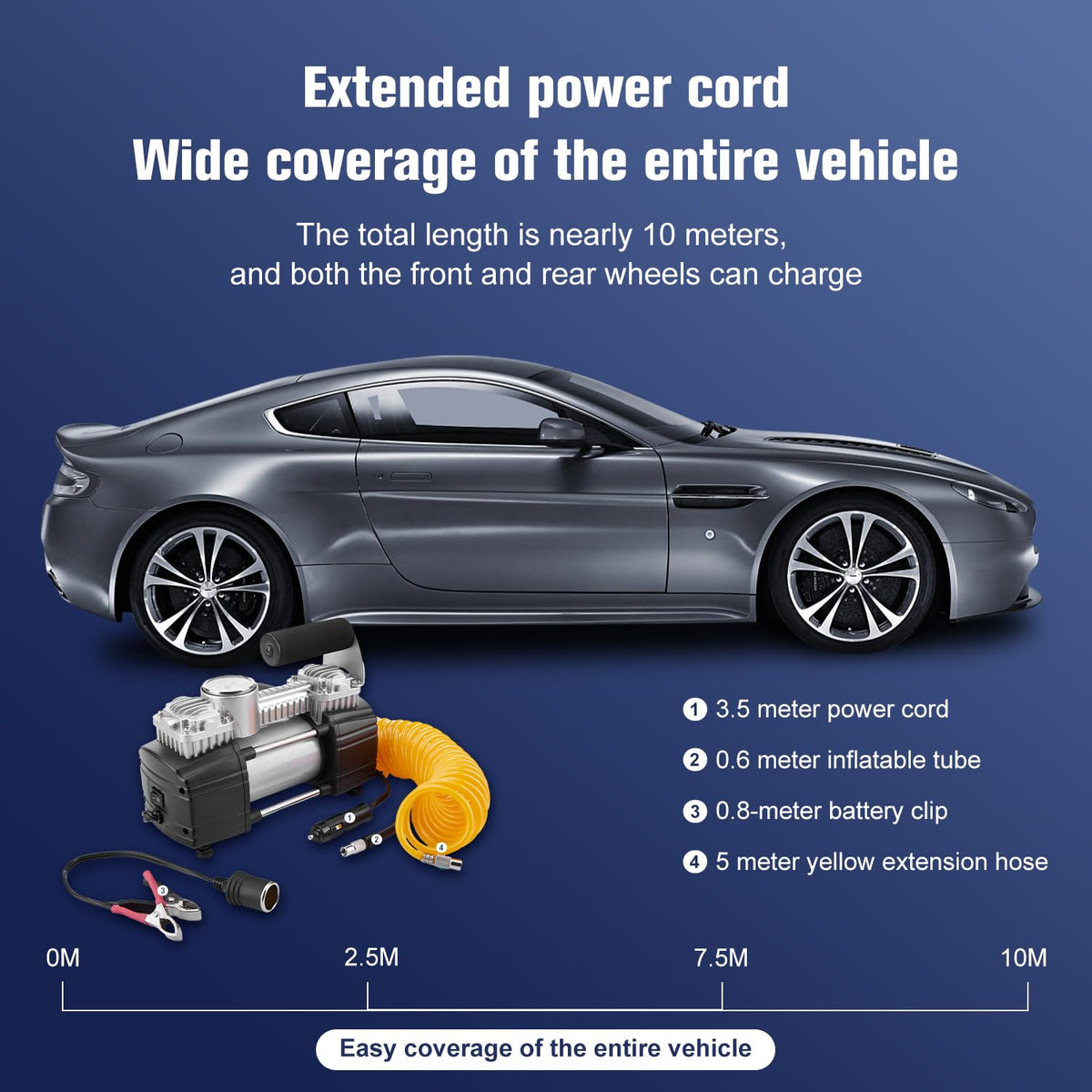 Q: What accessories come with the TIREWELL Tire Inflator?A: The TIREWELL Tire Inflator comes with a 5M extended air hose, a 0.8M high-quality battery clip for direct connection to a car battery, and three adapters for inflating motorcycles, bicycles, and balls.