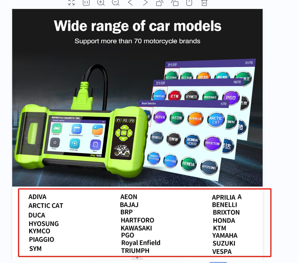 Q: What motorcycle brands are compatible with the TopDiag M300 diagnostic instrument?A: The TopDiag M300 supports diagnostics for over 70 motorcycle brands, making it a versatile tool for various models and types of motorcycles.