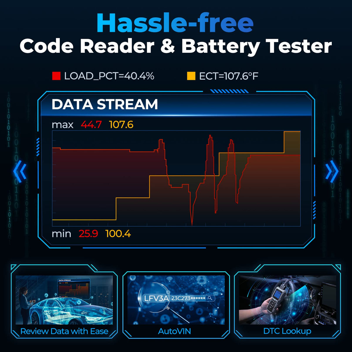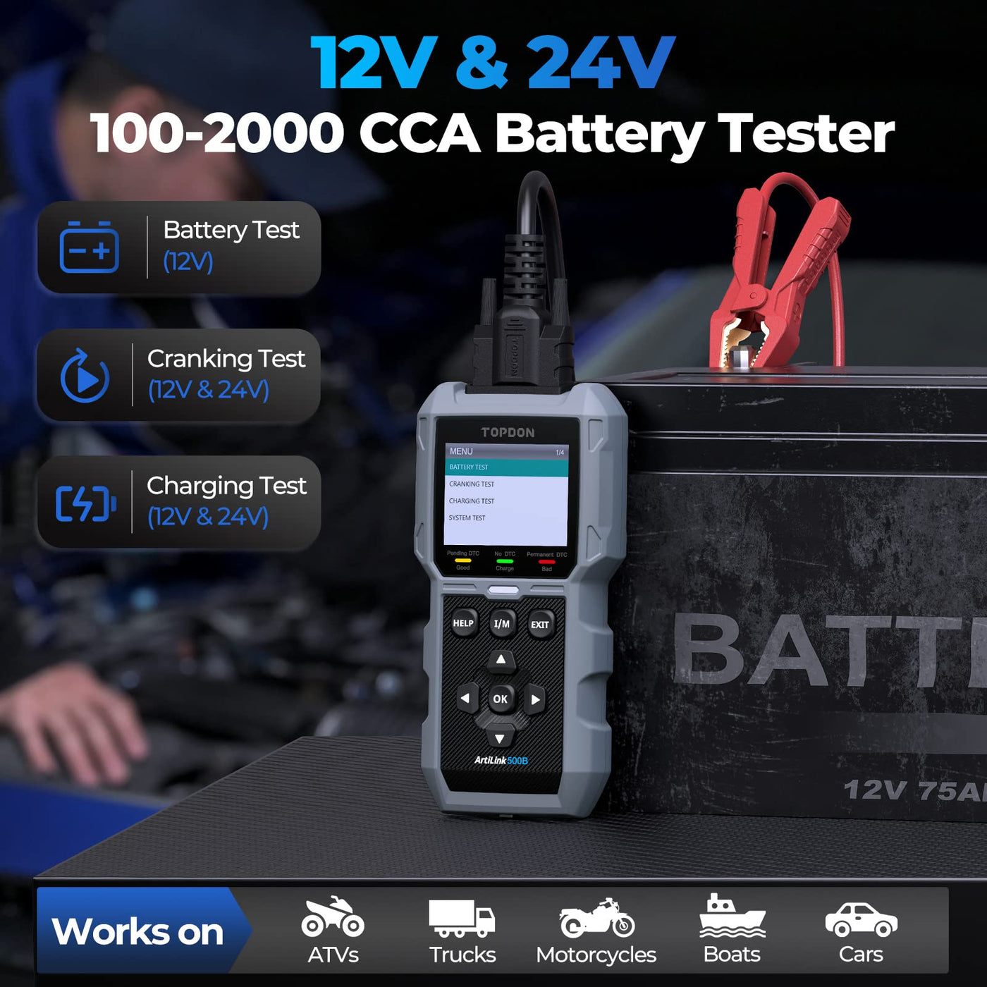 Q: How does the battery testing feature work?A: The AL500B's battery testing feature assesses the health of 12V batteries by measuring voltage, current, charge status, and internal resistance. It also performs cranking and charging tests for both 12V and 24V batteries, giving you comprehensive insights into your vehicle's battery performance.