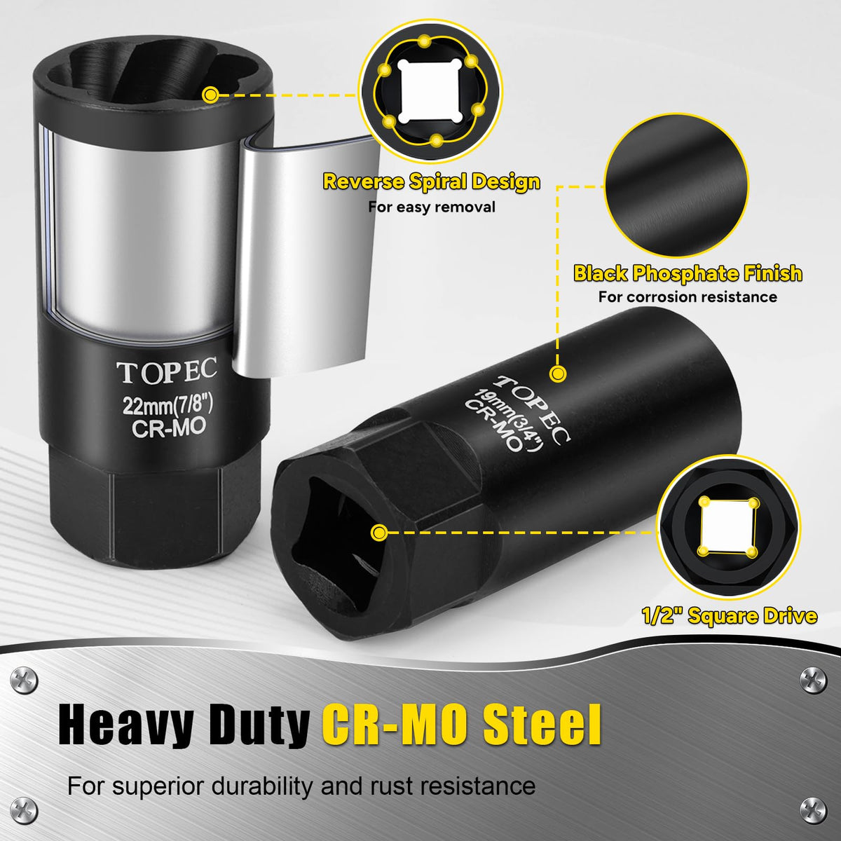 Topec lugnut extractor set engineered to tackle stubborn nuts and bolts in tight spaces. Stripped lug nut removal tool combines a 2.6'' extended height with reverse spiral grooves that grip deeper as you turn, ensuring no-slip removal of stripped, rusted, or damaged bolts and lug nuts. Crafted from CR-MO steel with a corrosion-resistant black phosphate coating, the tire lug nut remover is built to withstand heavy-duty impacts and long-term wear. Universal Twist sockets offer both Metric and SAE sizes (17mm-11/16'', 19mm-3/4'', 21mm-13/16'', 22mm-7/8'') to handle a wide range of automotive and machinery tasks. The wheel lock remover is stored in a case for easy portability and organization. Bolt extractor kit 1/2 inch drive works with both hand tools and power tools, such as wrenches, breaker bars, power drills. It's a versatile wheel nut removal tool that's perfect for automotive and mechanical work, car repairs, and DIY projects, making it an essential addition to any lug nut lock removal tool collection.