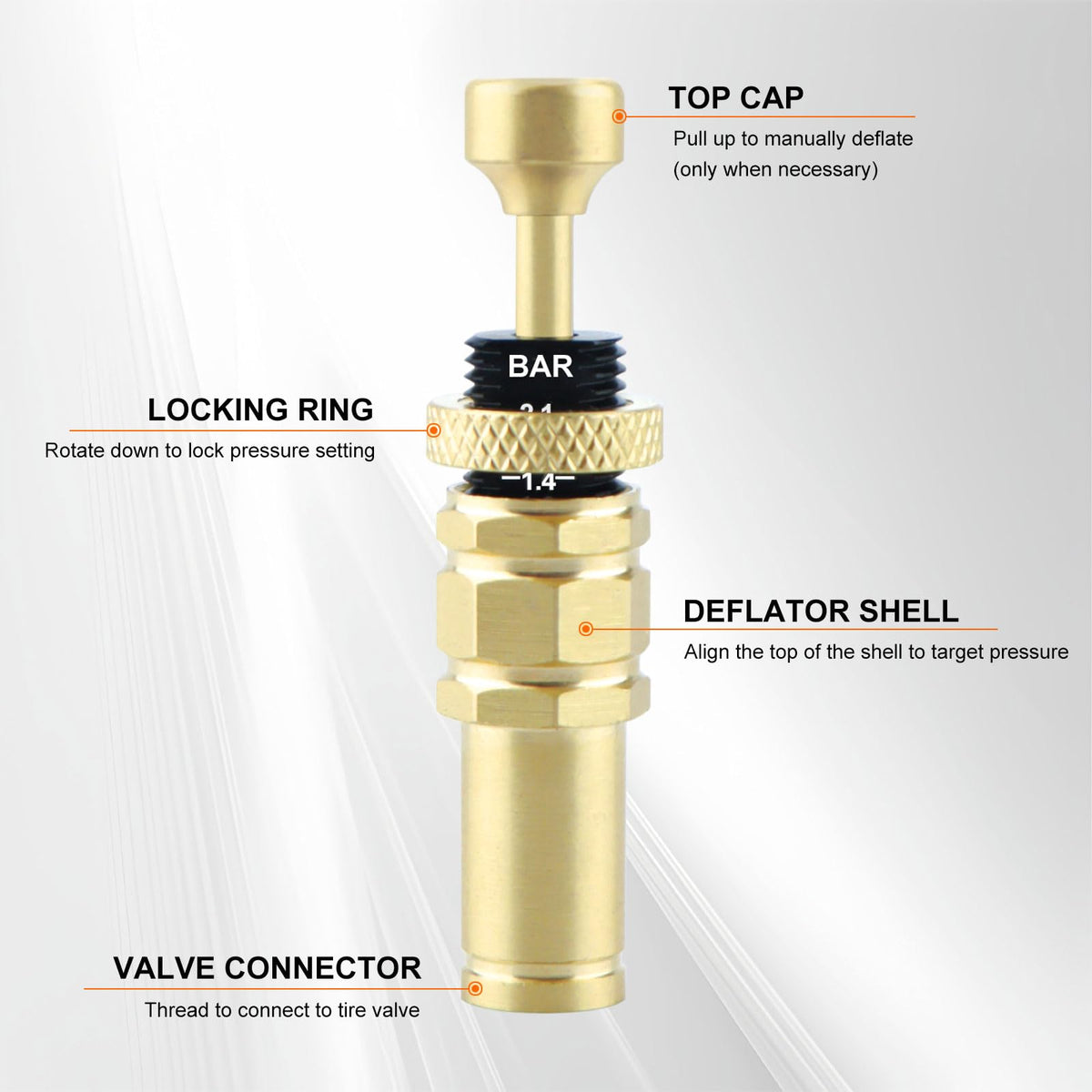 Adjustable Tire Deflators, 10-30 PSI - The Essential Off-Road Accessory Effortlessly prepare your vehicle for off-road adventures with our Adjustable Tire Deflators. Engineered for precision and durability, these deflators allow you to quickly and accurately air down all four tires to your desired pressure, ranging from 10 to 30 PSI. The auto-stop feature ensures consistent deflation, saving you time and effort. Crafted with a solid brass body, these deflators are built to withstand harsh conditions and resist corrosion, making them ideal for rugged terrains. The 2 PSI accuracy guarantees reliable performance for better traction and smoother rides. User-friendly features include a clear white scale on a black background for easy readability and a locking ring to secure your preferred pressure settings for future use. The set comes complete with four deflators and a convenient storage bag, ensuring your deflation tools are always organized and ready to go. Upgrade your off-road experience with this indispensable accessory, designed to make tire pressure adjustments fast, precise, and hassle-free.