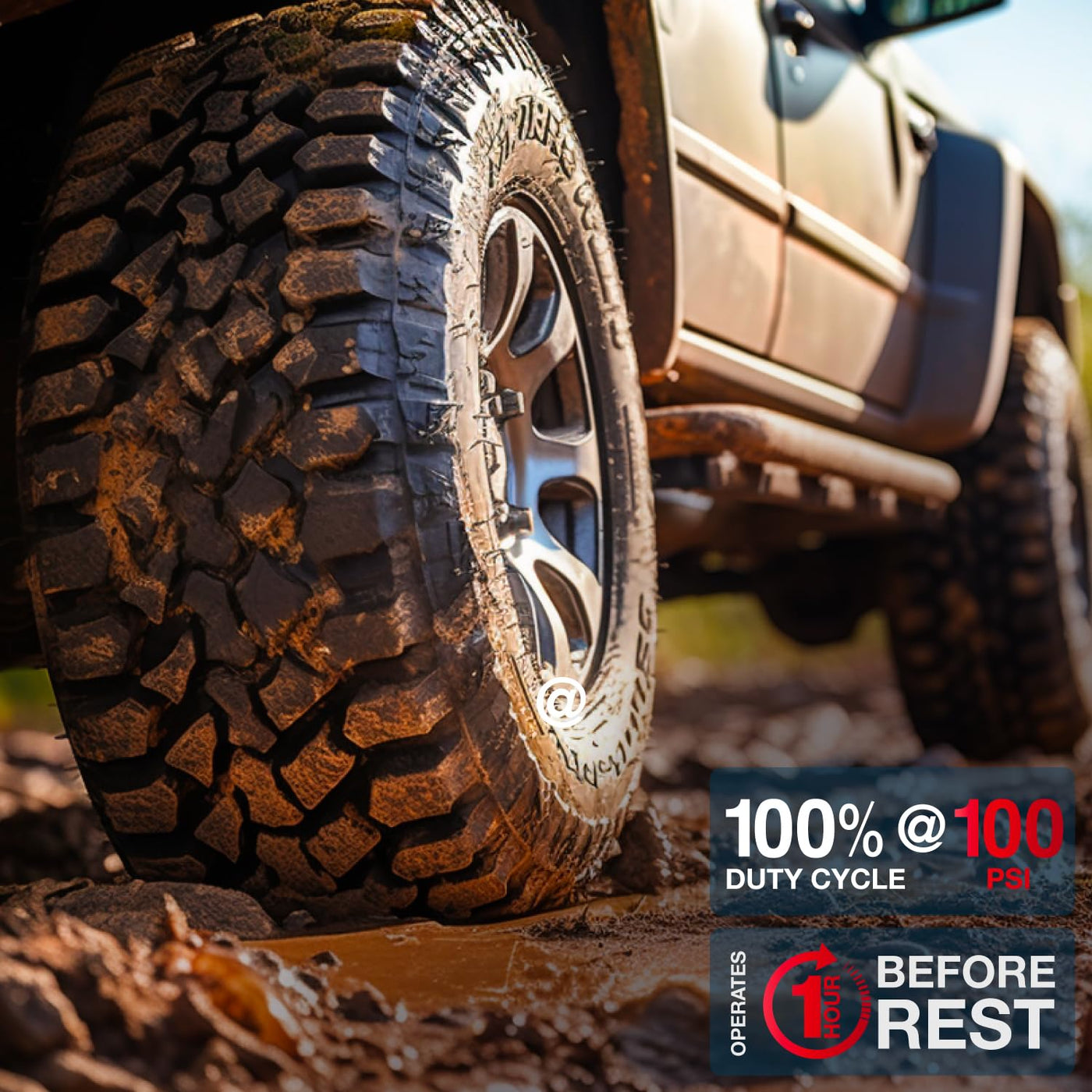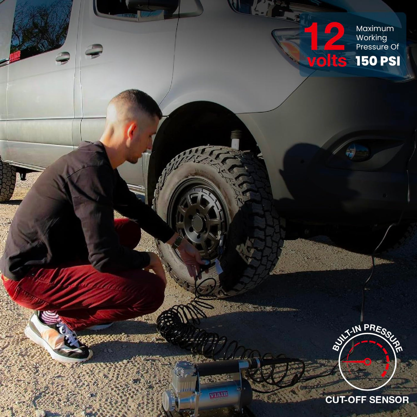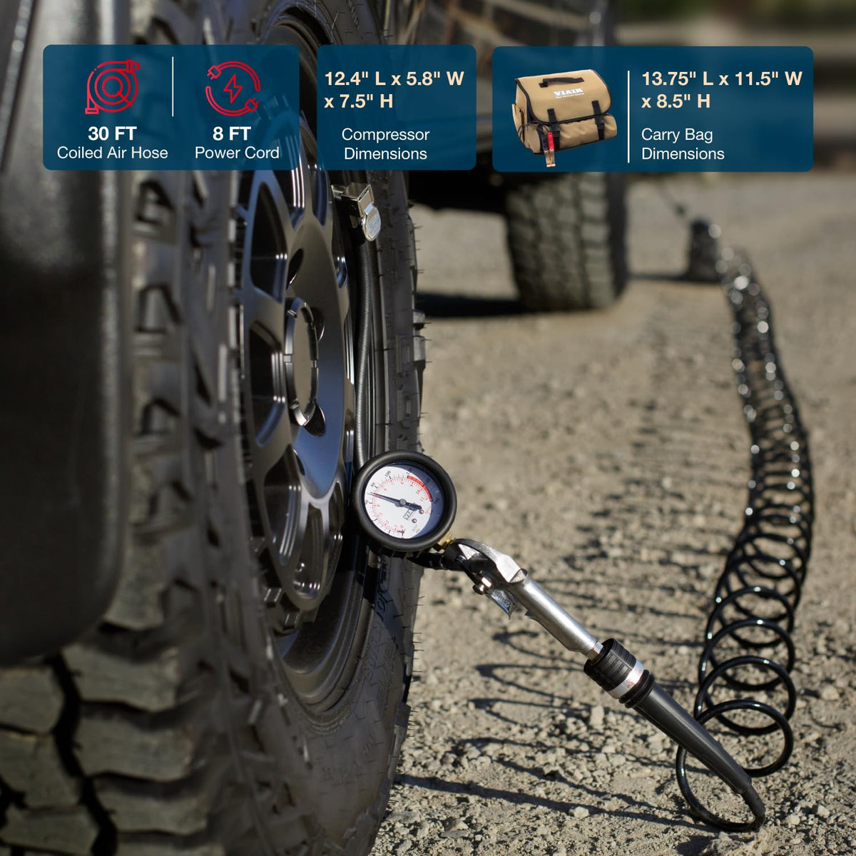 Product DescriptionBe prepared for tire emergencies with the VIAIR 450P Automatic Portable Compressor, the ultimate automatic tire inflator kit that assures dependability whether you are airing up after an off-road trip or facing an unexpected flat tire situation. Tailored for trucks, jeeps, and SUVs with tire sizes up to 42'', this portable air pump ensures peace of mind during every road adventure. The automatic portable air compressor is ideal for tire-to-tire transitions or when you want to check pressure mid-inflation. By eliminating manual on-off switching and streamlining the inflation process, our air pump will help increase efficiency and help you get back on the road quickly. The kit comes with a close-ended gas station-style air gun for added convenience. The deluxe dual-compartment carry bag, included with the air compressor kit, enhances portability and storability, ensuring no more scrambling during emergency situations.The tire inflator kit operates on 12-volts, delivering up to a maximum working pressure of 150 PSI and a 100% duty cycle; the free flow capacity is 1.80 CFM. The automatic air compressor operates for up to 1 hour at a time before needing a rest. The engine needs to be running during use for seamless operation.Amazon.comThe 450P Automatic is VIAIR's first Automatic shutoff function portable compressor and is rated for use with most any size tire. Powered by an easy-to-establish temporary connection to a 12-volt battery power source, this 100% duty cycle unit is capable of pressures up to 150 PSI continuously without the need to be rested. The 450P Automatic comes with a range of accessories stowable in its soft carry case, including a convenient close-ended gas station-style air gun. .caption { font-family: Verdana, Helvetica neue, Arial, serif; font-size: 10px; font-weight: bold; font-style: italic; } ul.indent { list-style: inside disc; text-indent: -15px; } table.callout { font-family: verdana; font-size: 11px; line-height: 1. 3em; } td.vgoverview { height: 125px; background: #9DC4D8 url(https://images-na.ssl-images-amazon.com/images/G/01/electronics/detail-page/callout-bg.png) repeat-x; border-left: 1px solid #999999; border-right: 1px solid #999999; padding-left: 20px; padding-right: 20px; padding-bottom: 10px; width: 250px; font-family: verdana; font-size: 12px; }Portable Auto Compression at 150 PSI with a 100% Duty CycleThe VIAIR 450P-Automatic Portable Compressor offers inflation of virtually any size tire, and operation at up to 150 PSI without the need to rest the unit. More than just a compressor, the 450P is a complete portable compression system, coming complete with an inflation gun with 200 PSI air pressure gauge, a 25' extension hose with quick connect coupler and lever chuck, a heavy duty sand tray with vibration isolators, a 8' power cable, a heavy-duty sand tray with vibration isolators, a 3-piece inflation tips kit, an inline fuse holder, a deluxe zippered carry bag and dual heavy duty direct battery clamps. The convenient battery clamps allow you to quickly utilize any 12-volt power source, including your own vehicle's battery, to address your air compression needs in seconds.Portable automatic air compression up to 150 PSI suitable for 37'' tires and larger.View larger.All your compression needs are in the bag.View larger.Heavy duty tray included for vibration control.View larger. The 450P also contains a convenient automatic time and power-saving features. The unit comes with an automatic shutoff function that will power down the 450P when the compressor is turned on, but not actively filling tires - making it unnecessary to turn the unit off between tire fills. In addition, the included closed-ended tire inflation gun allows for on-the-fly tire pressure reading, without having to turn the unit off to check tire pressure.450P Air Compressor Specifications Motor voltage - 12 volt Motor type - Permanent magnetic Max. duty cycle: 100% @ 100 PSI Max. working pressure - 150 PSI Max. Amp draw - 20 Amps Max. ambient temperature - 158F Min. ambient temperature - -40F CFM @ 0 PSI - 1.66 CFM @ 100 PSI: 0.94 Built-in pressure switch - 120 PSI on, 145 PSI off Fuse - 30 Amps Auto. Reset thermal protection - Yes Dimensions - 12.75''L x 4.00''W x 7.00''H Net weight - 9.75 lbs About Compressor Duty CycleCompressor duty cycle refers to amount of time a compressor can be operated in a given time period, at 100 PSI and at a standard ambient temperature of 72F. Duty Cycle is commonly expressed in percentile as: compressor on time (compressor on time + off time) %. As an example, a compressor that is rated for 25% duty cycle means that compressor can be operated at: 100 PSI @ 72F for 10 minutes on and 30 minutes off. 10 min. on / (10 min. on + 30 Min. off) = 10 min. / 40 Min = 25% duty cycle.Fill Rates:31'' x 10.5'' 33'' x 12.5'' 35'' x 12.5'' 37'' x 12.5'' 0 - 30 PSI 4 min. 05 sec. 5 min. 30 sec 6 min. 55 sec. 7 min. 56 sec. 15 - 30 PSI 2 min. 10 sec. 2 min. 50 sec