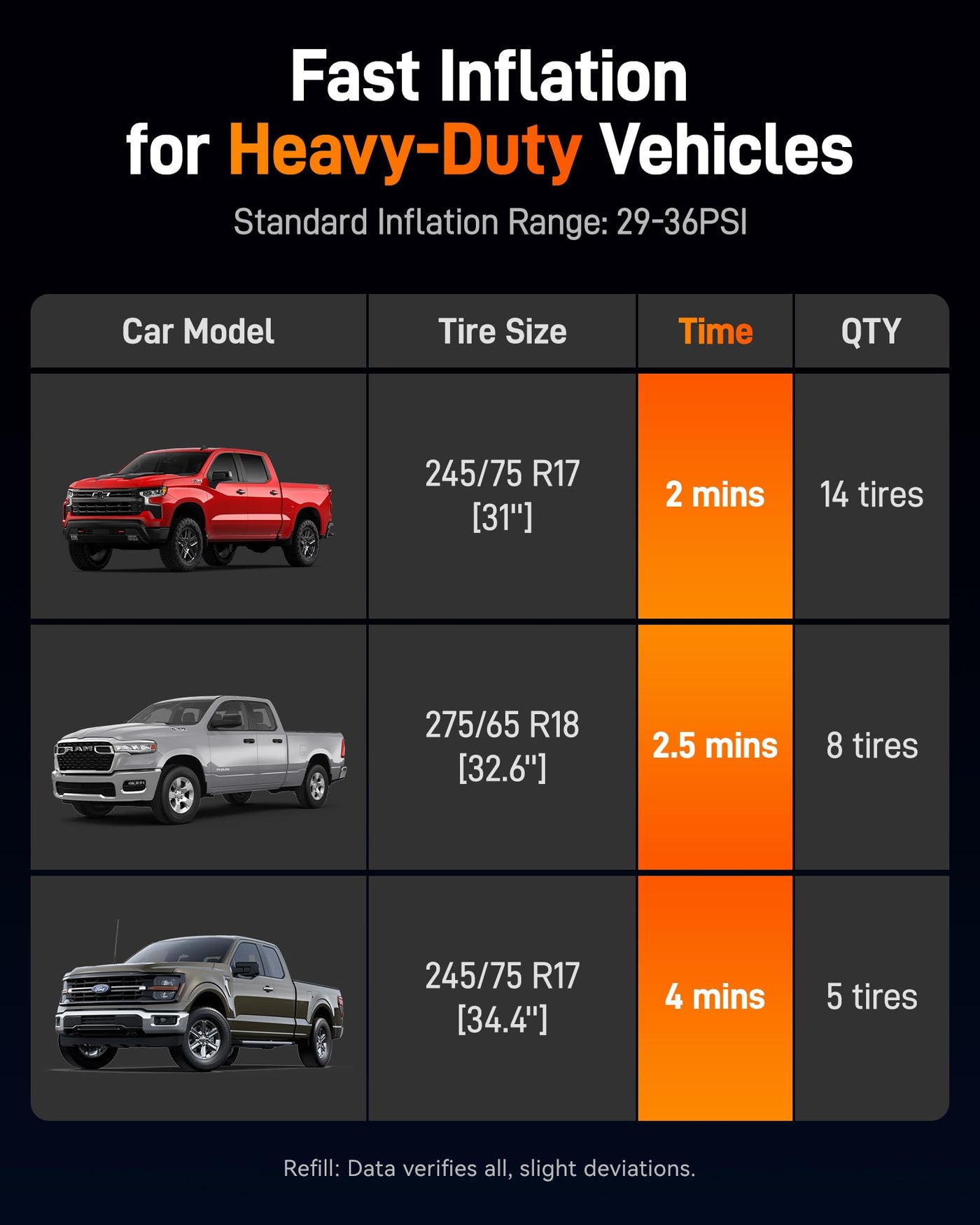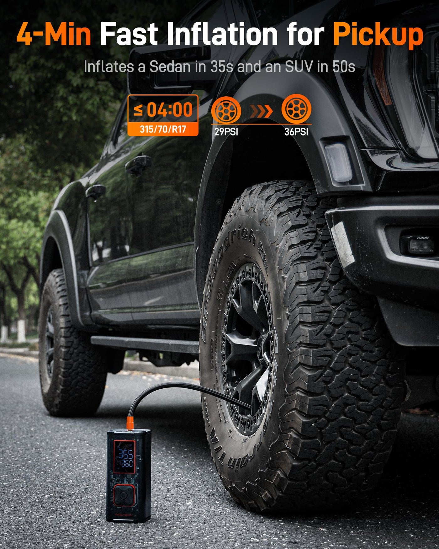 '58LPM & 35s fastest to inflate: The upgraded 58LPM dual-cylinder tire inflator can inflate a car tire (185/55/R14) in just 35 seconds, an SUV tire (225/45/R17) in 50 seconds, and a pickup truck tire (315/70/R17) in 4 minutes within the 29 PSI to 36 PSI range. It can fill your tire in the time it takes to watch a short video. 12000mAh&150PSI: With a 12000mAh(44.4WH) battery and 150 PSI max pressure, this air compressor can inflate 20 small car tires (185/55/R14), 14 medium SUV tires (225/50/R17), or 5.5 large truck tires (315/70/R17) from 29 to 36 PSI on one charge. That's enough to top up all four tires of any family car in one go. 3.5'' Accurate Led Digital Dual Display: This portable air compressor has a screen that displays the real-time tire pressure, while the other allows you to select preset types or values. This makes it convenient to monitor and operate, enabling you to check tire pressure anytime, anywhere. 45W Quick Charger&LED light 45W USB-C interface of this car tire air pump can fully charge the inflator in about 1 hour. It also charges your phone and other devices and has an LED light with lighting and SOS modes for nighttime use. 2 Usage Modes & 11FT Power Cord: The tire inflator supports both 12V DC power mode and built-in battery power mode. We use a threaded air nozzle for a better fit with the tire, preventing leaks and increasing durability. The packaging also includes a 20'' hose, an 11' DC 12V Power Cord and a C to C cable, a hose connector, and various needle adapters for cars, motorcycles, bicycles, and balls. pressure moto auto electric cordless inflador gauge battery wheel compressors 12v cars inflators avid power mini x8 apex smart powered rechargeable x9 pumps ai operated automatic nail inflar accessories parts digital flat small hand handheld air pump inflater dc port til 150psi multi best''