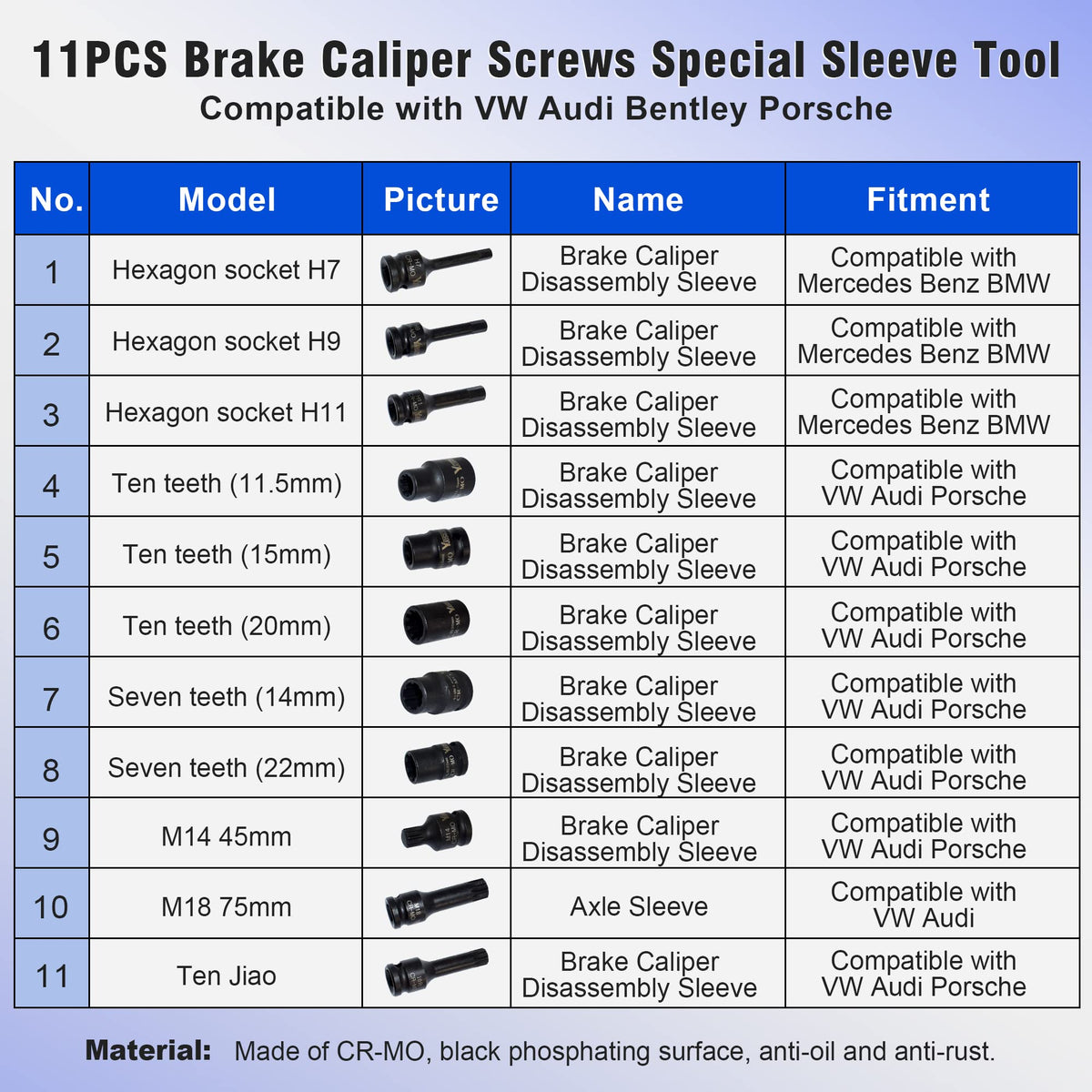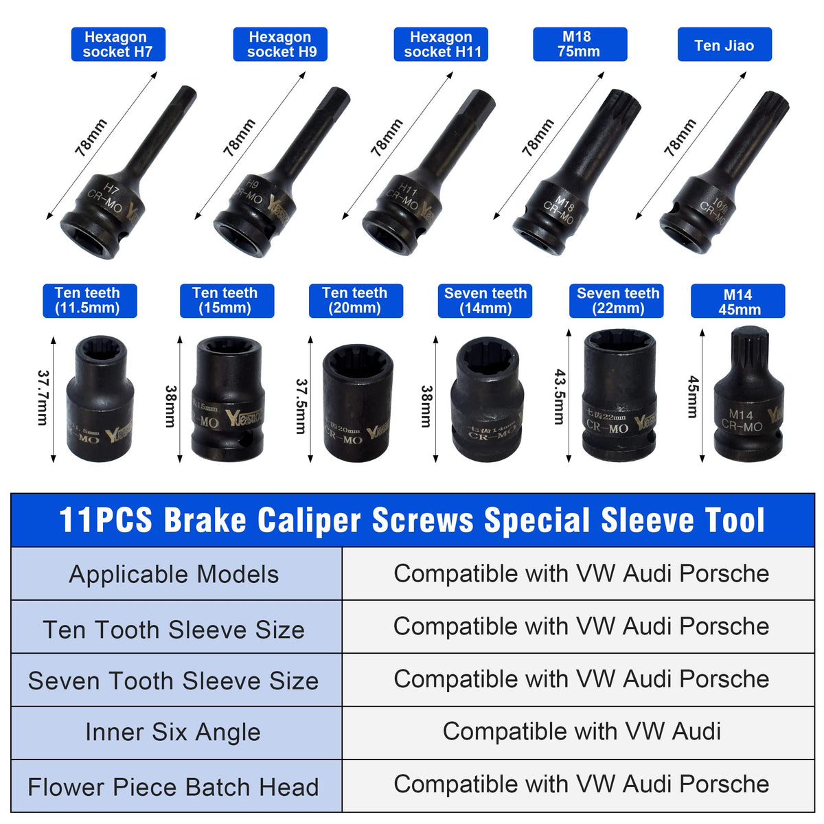 11Pcs Brake Caliper Socket Kit Hexagon Socket H7, Brake Caliper Disassembly Sleeve, Compatible With Mercedes Benz Bmw Hexagon Socket H9, Brake Caliper Disassembly Sleeve, Compatible With Mercedes Benz Bmw Hexagon Socket H11, Brake Caliper Disassembly Sleeve, Compatible With Mercedes Benz Bmw Ten Teeth (11.5Mm), Brake Caliper Disassembly Sleeve, Compatible With Vw Audi Porsche Ten Teeth (15Mm), Brake Caliper Disassembly Sleeve, Compatible With Vw Audi Porsche Ten Teeth (20Mm), Brake Caliper Disassembly Sleeve, Compatible With Vw Audi Porsche Seven Teeth (14Mm), Brake Caliper Disassembly Sleeve, Compatible With Vw Audi Porsche Seven Teeth (22Mm), Brake Caliper Disassembly Sleeve, Compatible With Vw Audi Porsche M14 45Mm, Brake Caliper Disassembly Sleeve, Compatible With Vw Audi Porsche M18 75Mm, Axle Sleeve, Compatible With Vw Audi Ten Jiao, Brake Caliper Disassembly Sleeve, Compatible With Vw Audi Porsche