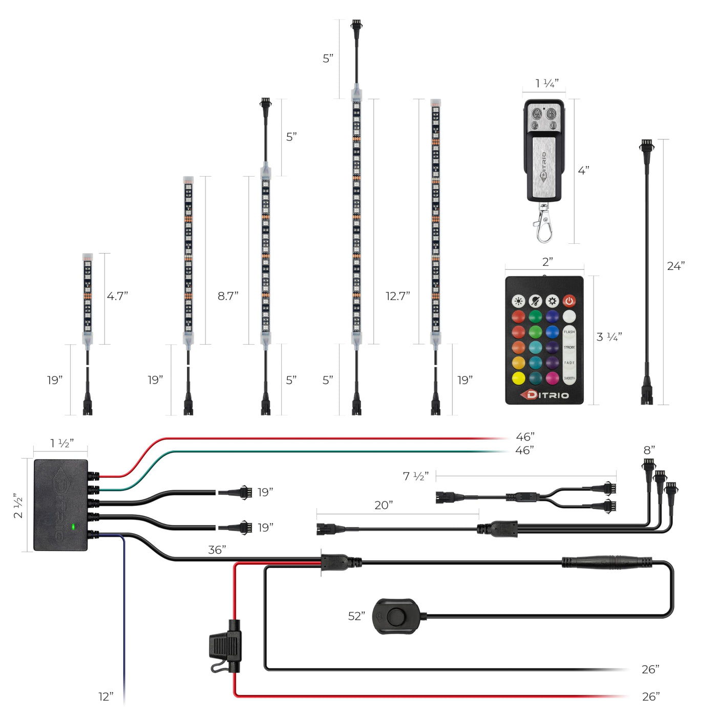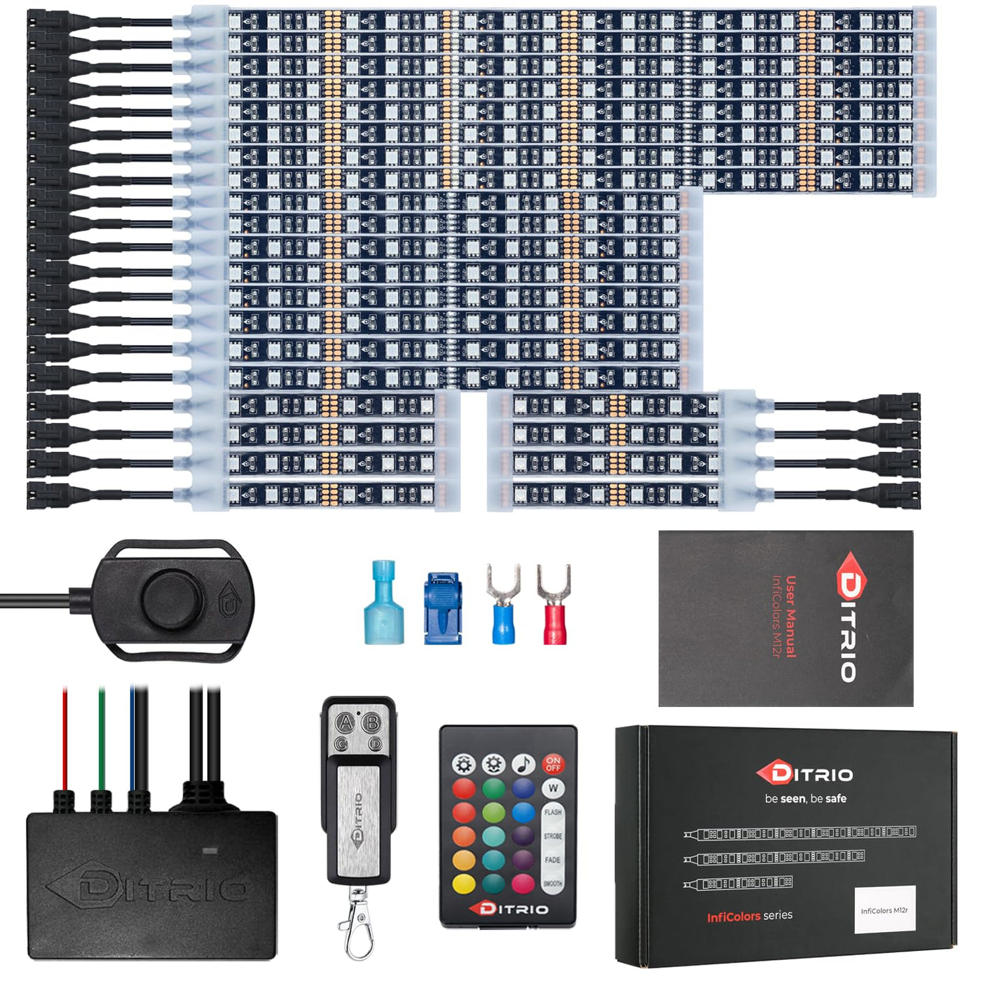 ?Sophisticated Design?This LED strip kit combines 3 basic functions that make it safer for you to ride at night - optimum lighting, additional brake light, and turn signal features. | ?Turn Signal?The control box divides LED strips into 2 zones - left and right. When you press the turn signal button, all strips on the same side will blink in amber, making your changes more noticeable. | ?Maximum Brightness?Maximizing brightness is a priority for the design of this LED strip kit M18r-T, which includes choosing premium materials for LED strips and assuring optimum power supply from the circuit. | ?Output for Larger Bikes?The control box has a bigger circuit board, which has at least 2X capacity than the regular one. It provides sufficient power supply to more LED strips and you won