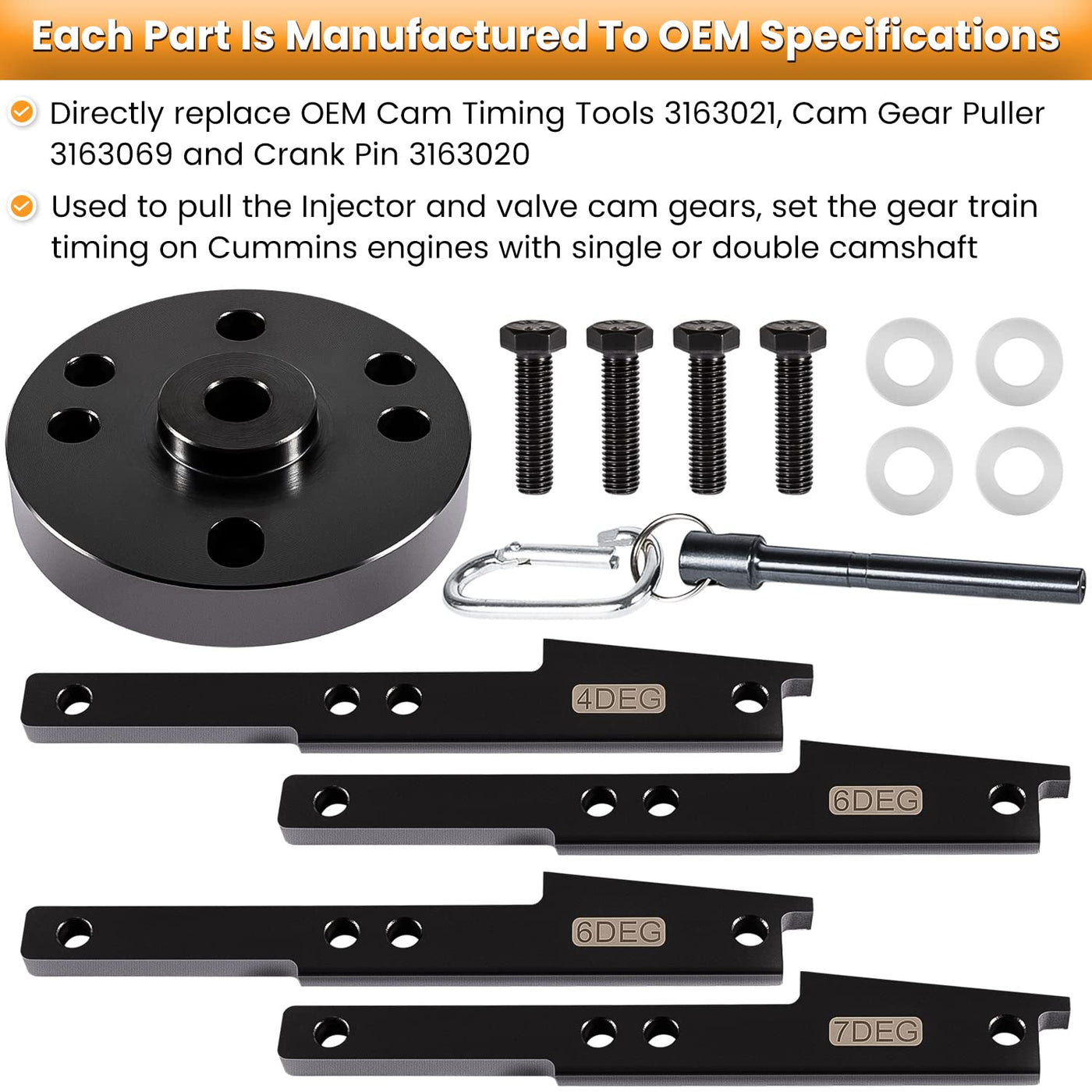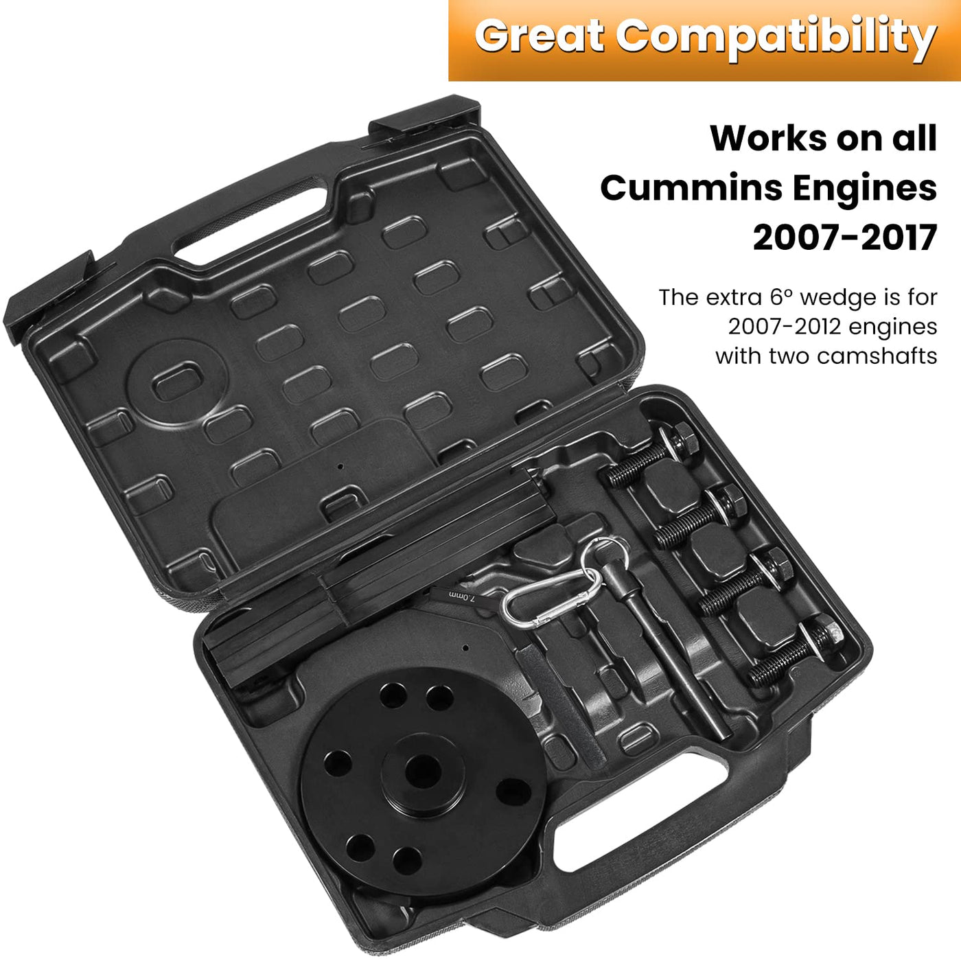 Q: What Cummins engine models is the Cam Timing Tool Kit compatible with?A: The Cam Timing Tool Kit is designed to perfectly fit all Cummins Engines from 2007 to 2017, including models such as ISX, QSX, and X15.