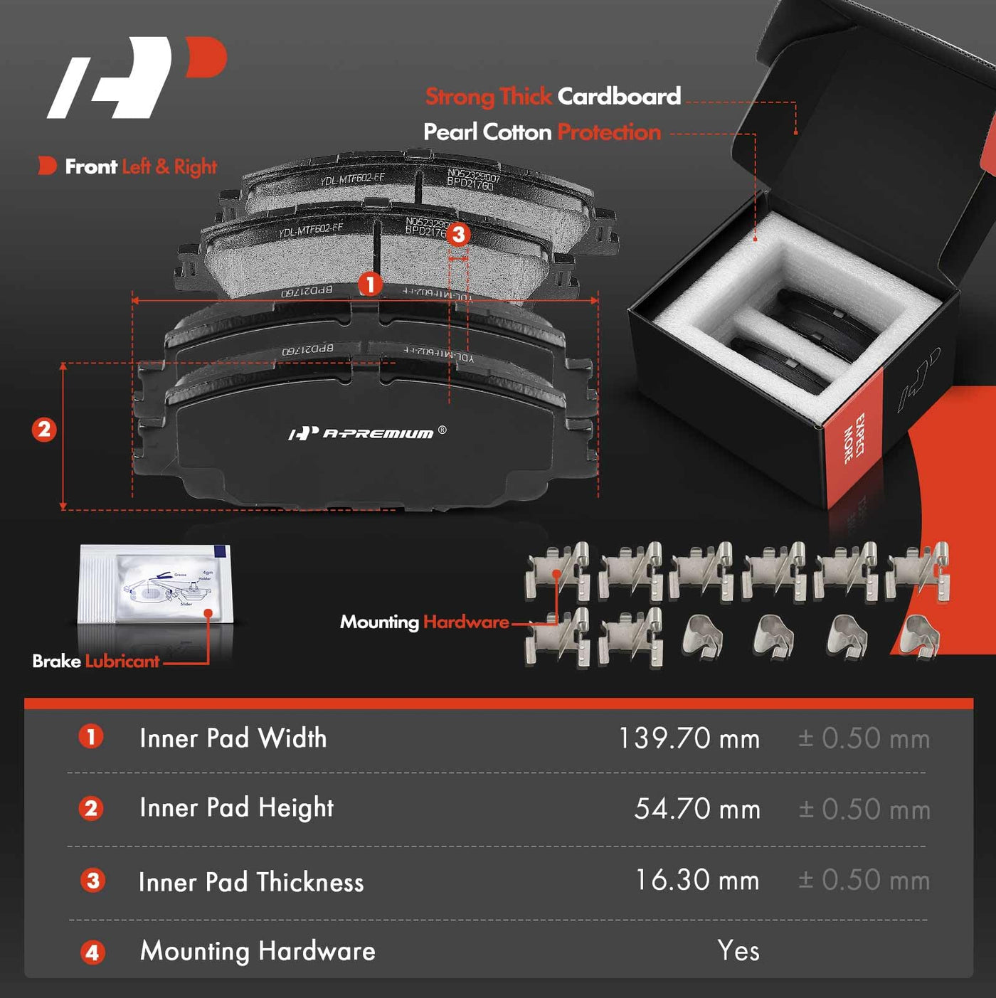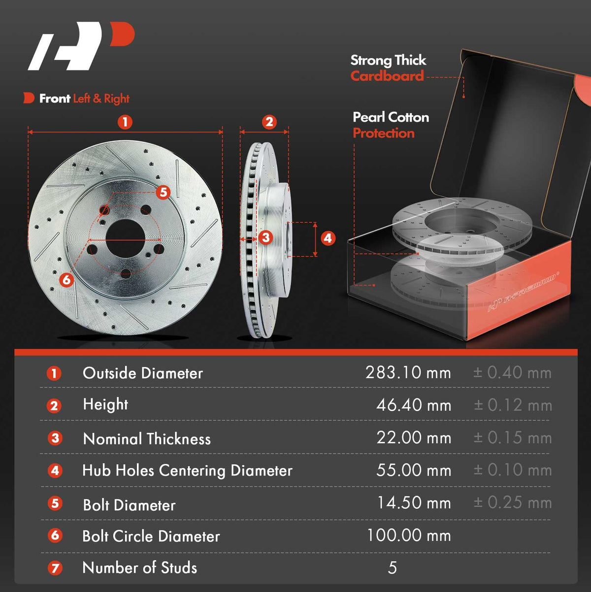 A-premium Drilled Brake Rotors and Brake Pads are an ideal choice to replace your broken Drilled Brake Rotors and Brake Pads. All Drilled Brake Rotors and Brake Pads meet or exceed OEM specifications. Due to high manufacturing standard, it will come with one year quality guarantee. Compatible with Toyota Models: 2019-2019 Corolla L4 2.0L Hatchback 2020-2020 Corolla Except Hybrid; Hybrid LE; S Model; Gas 2021-2021 Corolla GAS 2022-2022 Corolla L4 2.0L GAS 2022-2022 Corolla L4 1.8L GAS 2020-2022 Prius Prime Specifications: Rotor Material: Cast Iron Outside Diameter (MM): 283.1 mm Height (MM): 46.4 mm Nominal Thickness (MM): 22 mm Hub Holes Centering Diameter (MM): 55 mm Mounting Bolt Hole Quantity: 5 Bolt Circle Diameter (MM): 100 mm Bolt Diameter (MM): 14.5 mm Discard Min. Thickness (MM): 19 mm Solid Or Vented Type Rotor: Vented Pad Backing Material: Iron Pad Wear Sensor Included: No Brake Lubricant Included: Yes Friction Material Composition: Ceramic Inner Pad Width without Shim (mm): 139.7 mm Inner Pad Height without Shim (mm): 54.7 mm Inner Pad Thickness without Shim (mm): 16.3 mm Slotted: Yes Mounting Hardware Included: Yes OEM Number: S-12144206, D2176, 12044206, AD9421, PF9421X, SG9421X Location: Front Left and Right (Driver and Passenger Side) Quantity Sold: A Set of Six Pieces