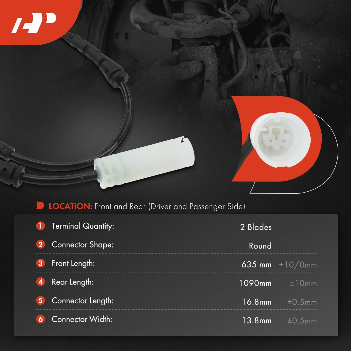 Q: What are the specifications of the A-Premium Brake Pad Wear Sensors?A: The specifications include a mounting location at the brake caliper, 2 pins for terminal quantity, round connector shape, and specific lengths of 635 mm for the front and 1090 mm for the rear sensors.