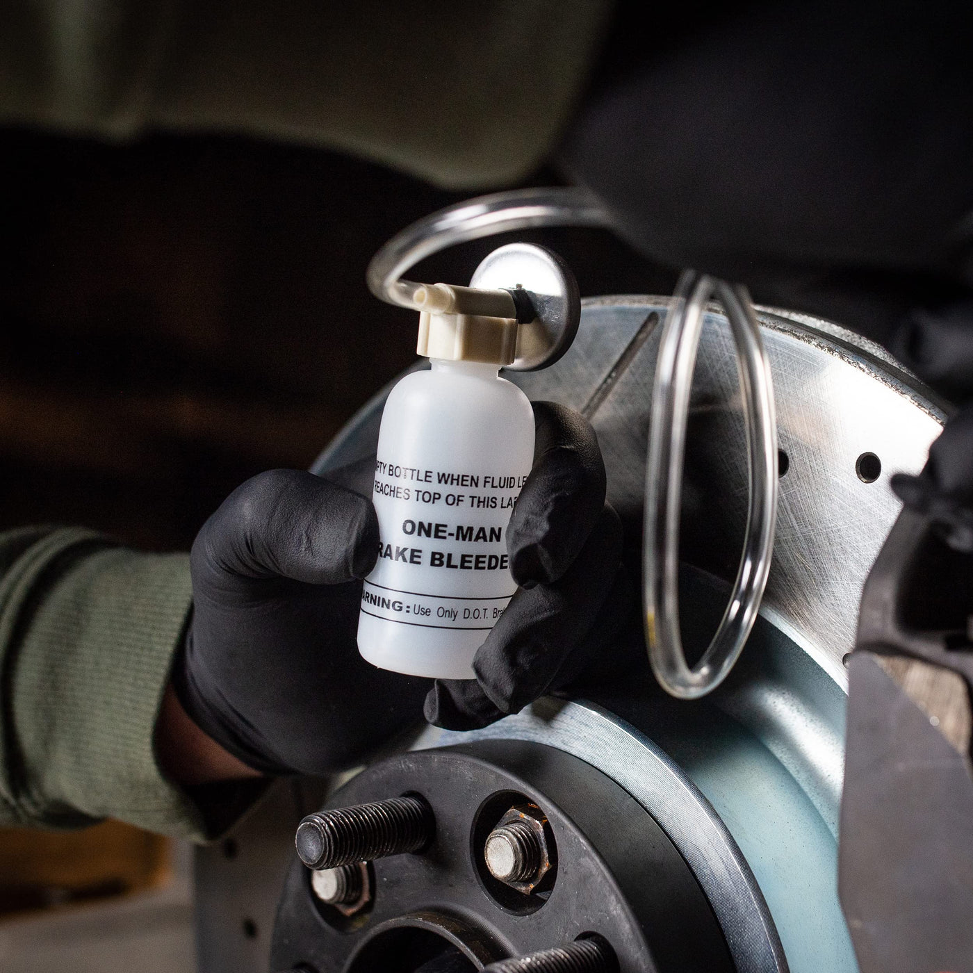 Q: How does the ABN One Man Brake Bleeder Kit work?A: The ABN One Man Brake Bleeder Kit allows you to bleed your brakes by yourself. It includes a magnetic plate that holds the plastic bleed bottle upright while you pump the brake pedal. This prevents spills and makes the process quicker compared to traditional gravity bleeding methods.