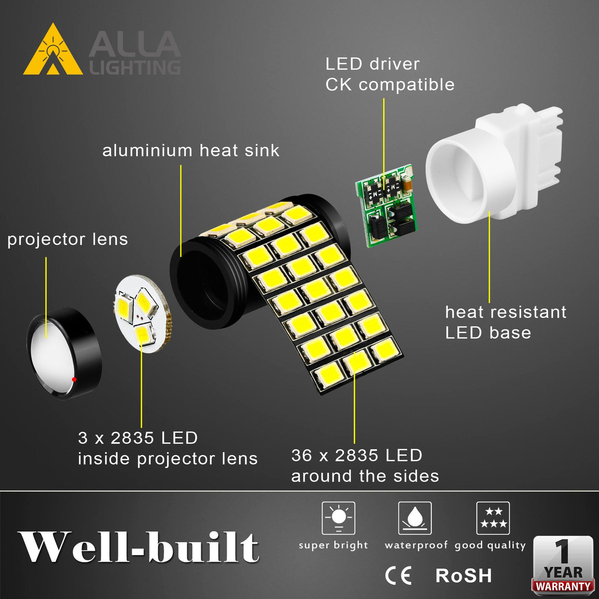 Q: How many LED chips are used in each bulb and what is their power?A: Each Alla Lighting T20 7440 7443 bulb is equipped with 39 high-power 2835 LED chips, providing super bright illumination for brake lights, tail lights, and back-up reverse lights.