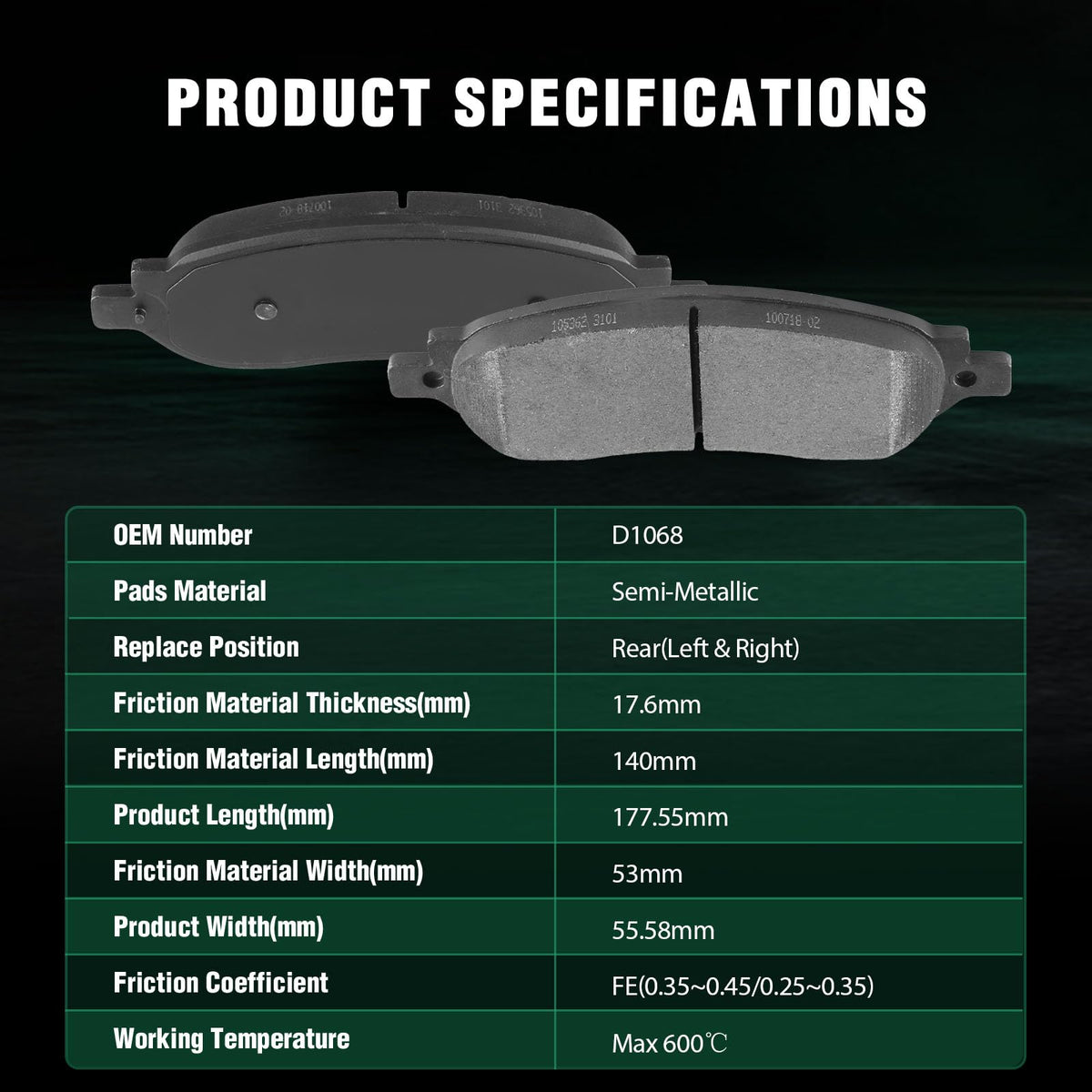 Automuto 4Pcs Rear Semi-Metallic Disc Brake Pads Set D1068 For Ford For F-250 Super Duty 2005-2007, For Ford For F-350 Super Dut