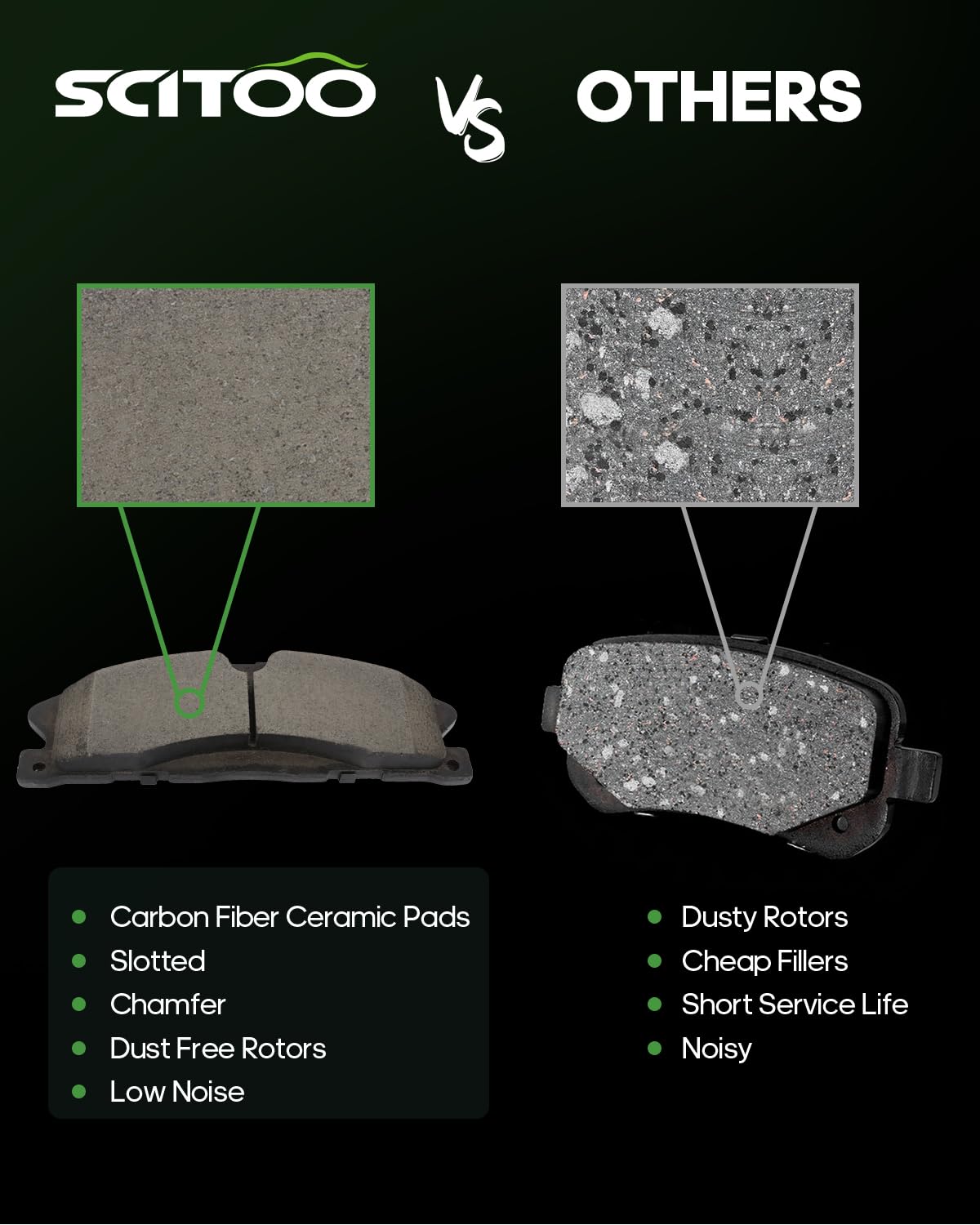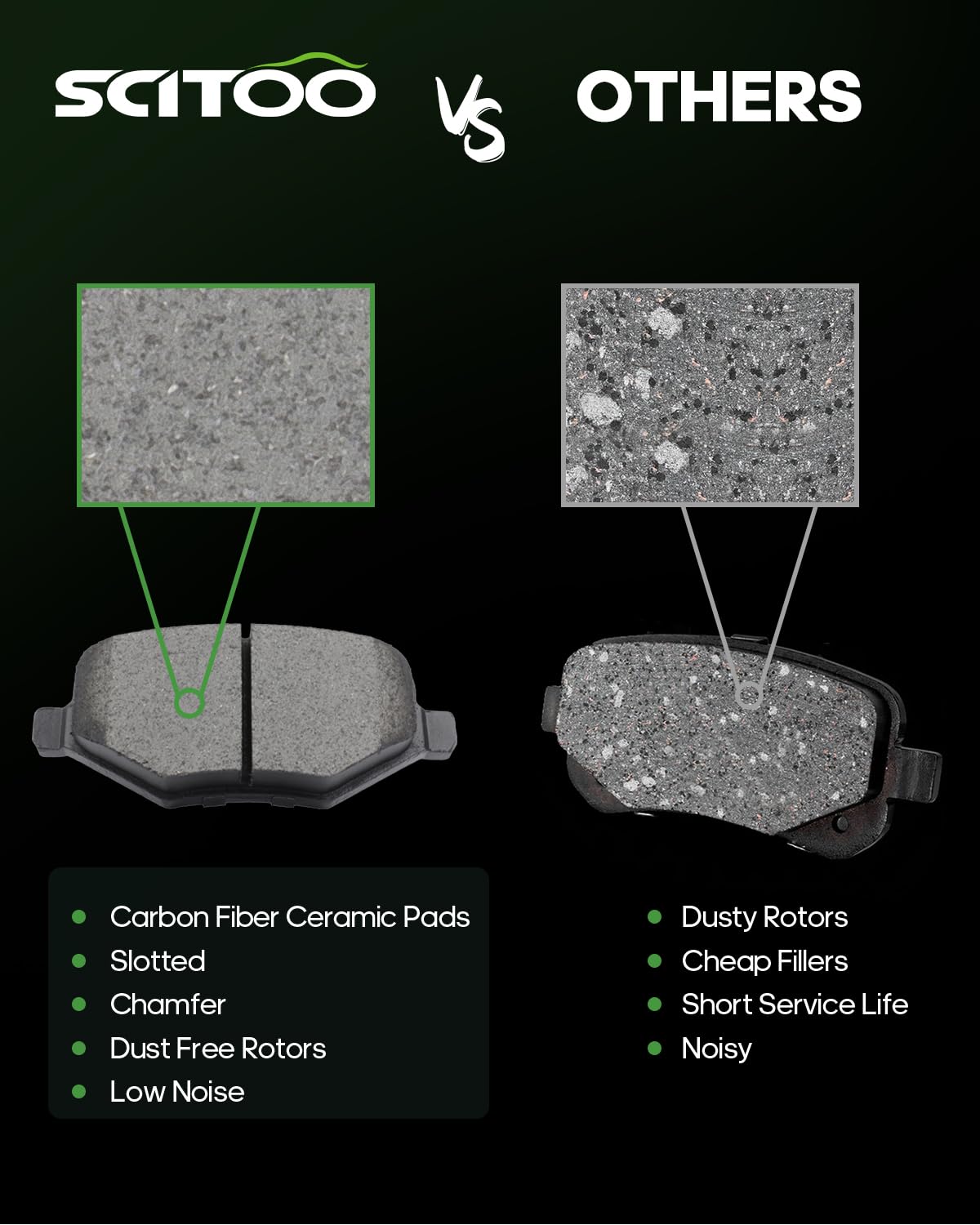 Q: How do SCITOO Ceramic Brake Pads improve braking performance?A: These ceramic brake pads are treated with a scorch friction process that enhances their performance by reducing break-in time, ensuring consistent braking characteristics throughout their lifespan.