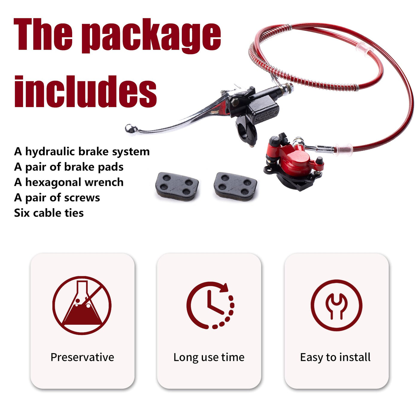 Q: What is included in the CIOM Hydraulic Disc Brake Assembly Kit?A: The kit includes a hydraulic brake system, a pair of brake pads, a hexagonal wrench, a pair of screws, and six cable ties for easy installation and maintenance.