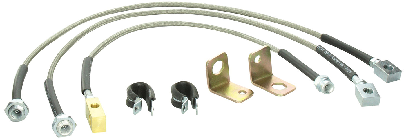 Q: What materials are used in the Crown Automotive Brake Hose Kit?A: This brake hose kit is made from high-quality stainless steel, which offers durability and resistance to corrosion, ensuring reliable performance in various driving conditions.