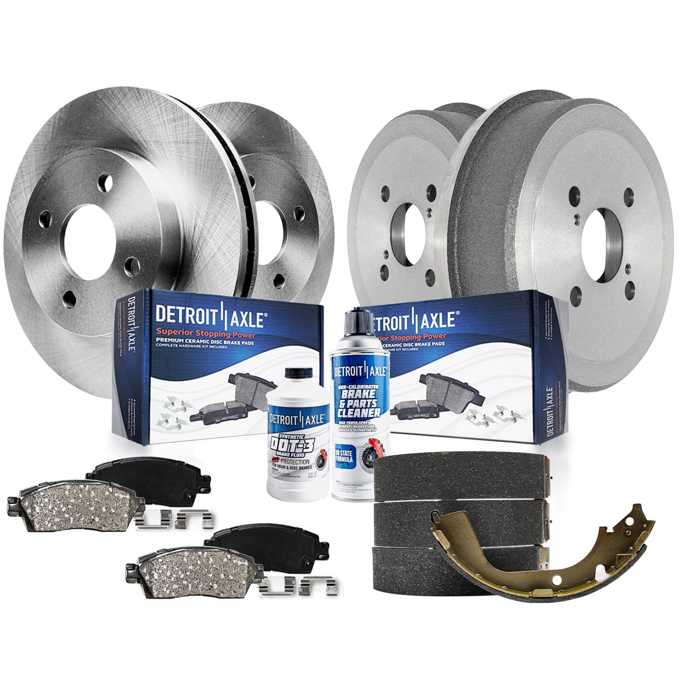 Kit Includes: 2x Front Disc Rotors: R-31056 2x Rear Brake Drums: DR-3578 2x Front Ceramic Brake Pads (Hardware Included): P-741 2x Rear Semi-metallic Brake Shoes: SH-597 1x 10oz Brake Cleaner Spray 1x 12oz Brake Fluid Bottle Fitment: Replacement for 1998-2002 Chevrolet Prizm (Rear Drum Brakes) Replacement for 1998-2002 Toyota Corolla (Rear Drum Brakes) Introduction: Detroit Axle is a leading global retailer and distributor of OE re-manufactured and new aftermarket auto parts. We are committed to providing first-class products and outstanding customer service at an incredible value. Our rapidly-expanding product line includes CV Axles, Wheel Hub & Bearings, Suspension & Chassis parts, Complete Strut Assemblies, Shock Absorbers, Drilled & Slotted Brake Rotors, Conventional Brake Rotors, Ceramic Brake Pads, Brake Fluids, Brake Cleaners, Rack & Pinion Assemblies, Gearboxes, Drive Shafts, Transmissions, Brake Calipers, Wheel Lug Nuts, and more. With over 30 years of experience, we are proud that millions of customers around the world rely on Detroit Axle parts. We have two Metro Detroit storefront locations on the north and west sides of the city. Our flagship location, in the heart of Detroits 8 Mile Road, is a combined retail storefront and over 180,000 square feet of the warehouse that serves as our global distribution center.
