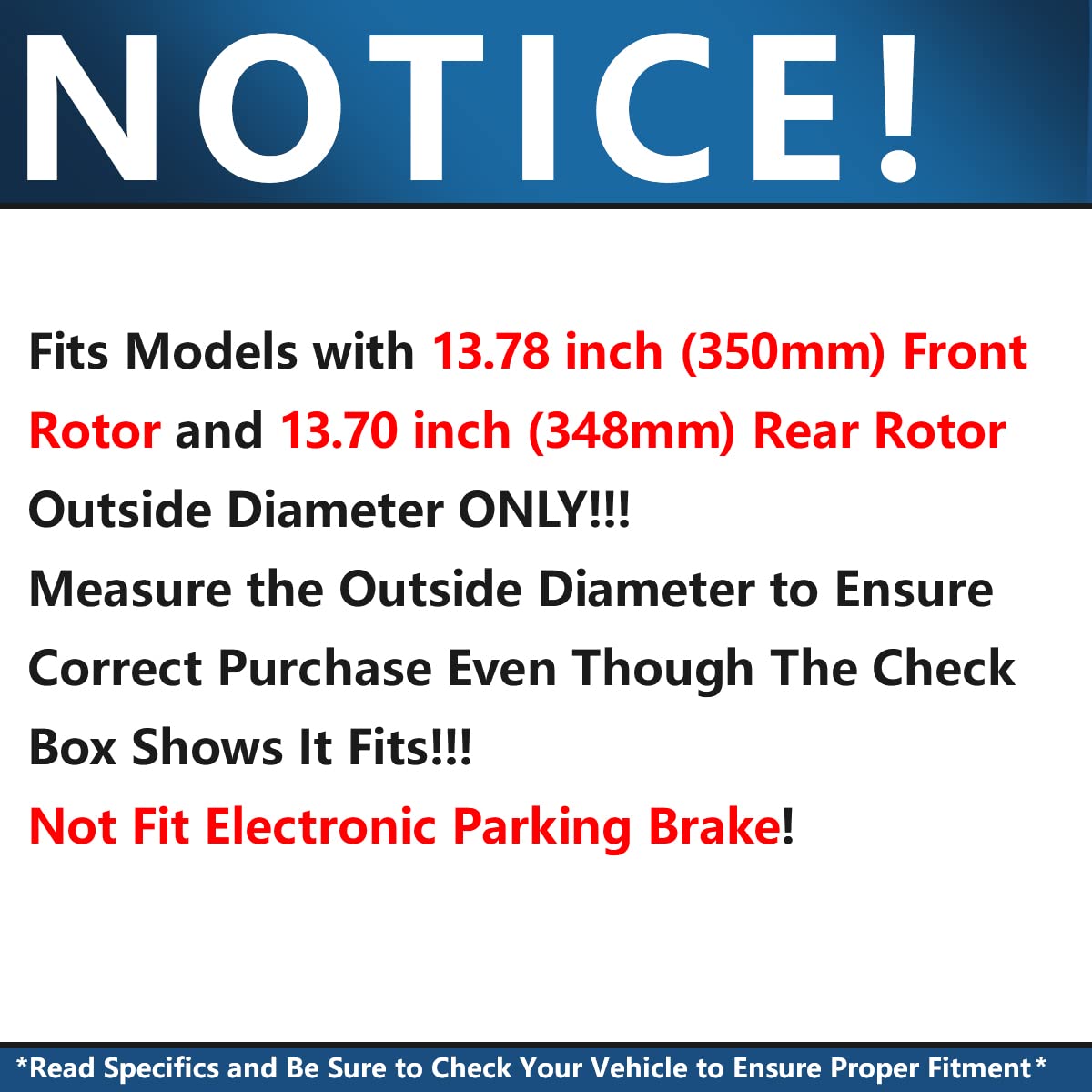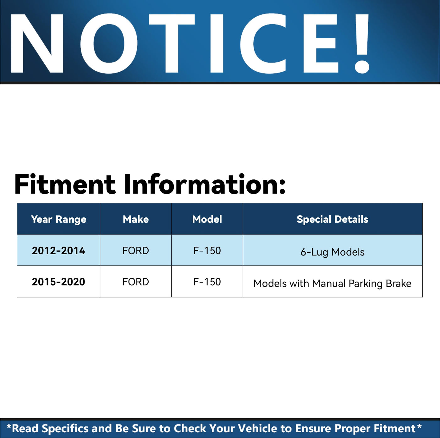 Kit Includes: 2x Front Drilled & Slotted Disc Brake Rotors: S-54153 2x Rear Drilled & Slotted Disc Brake Rotors: S-54186 2x Front Ceramic Brake Pads (Hardware Included): P-1414 2x Rear Ceramic Brake Pads (Hardware Included): P-1602 1x 10oz Brake Cleaner Spray & 1x 12oz Brake Fluid Bottle ***Fits Models with 13.78 inch (350mm) Front Rotor and 13.70 inch (348mm) Rear Rotor Outside Diameter ONLY!!! Measure the Outside Diameter to Ensure Correct Purchase Even Though The Check Box Shows It Fits!!!*** ***Not Fit Electronic Parking Brake!*** Fitment: Replacement for 2012-2014 Ford F-150 (6-Lug Models) Replacement for 2015-2020 Ford F-150 (6-Lug Models With Manual Parking Brake) Introduction: Detroit Axle brake rotors and pads are manufactured to exceed original equipment standards and provide a better riding vehicle. We are a leading supplier of ride control products to OE vehicle manufacturers Nationwide, that expertise translates to Detroit Axle's OE-quality Aftermarket. With over 30 years of experience, we are proud that millions of customers around the world rely on Detroit Axle parts. We have two Metro Detroit storefront locations on the north and west sides of the city. Our flagship location, in the heart of Detroits 8 Mile Road, is a combined retail storefront and over 180,000 square feet of the warehouse that serves as our global distribution center.