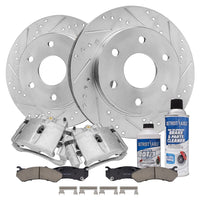 Kit Includes: 2x Front Drilled & Slotted Brake Rotors - S-55054 2x Front Ceramic Brake Pads (Hardware Included) - P-785 1x Front Disc Brake Caliper - Driver Side - 18B4729 1x Front Disc Brake Caliper - Passenger Side - 18B4728 1x 10oz Brake Cleaner Spray 1x 12oz Brake Fluid Bottle Fitment: **For Models with 12 inch (305mm) Front Rotors** Replacement for 2002-2006 Cadillac Escalade Replacement for 2003-2006 Cadillac Escalade ESV Replacement for 2002-2006 Cadillac Escalade EXT Replacement for 2003-2005 Chevrolet Astro Replacement for 2002-2006 Chevrolet Avalanche 1500 Replacement for 2003-2008 Chevrolet Express 1500 Replacement for 2003-2005 Chevrolet Express 2500 (7300lb Gross Vehicle Weight) Replacement for 1999-2004 Chevrolet Silverado 1500 Replacement for 2005-2006 Chevrolet Silverado 1500 (Fits Models With 4-Wheel Disc Brakes) Replacement for 2000-2006 Chevrolet Suburban 1500 Replacement for 2000-2006 Chevrolet Tahoe (Fits Models With Rear Disc Brakes) Replacement for 2003-2005 GMC Safari Replacement for 2003-2008 GMC Savana 1500 Replacement for 2003-2005 GMC Savana 2500 (7300lb Gross Vehicle Weight) Replacement for 1999-2004 GMC Sierra 1500 Replacement for 2005-2006 GMC Sierra 1500 (Fits Models With Rear Disc Brakes; 2005: 4.8L, 5.3L Only) Replacement for 2000-2006 GMC Yukon (Fits Models With Rear Disc Brakes; 2001: SLE, SLT; 2000: 5.3L, 4.8L) Replacement for 2000-2006 GMC Yukon XL 1500