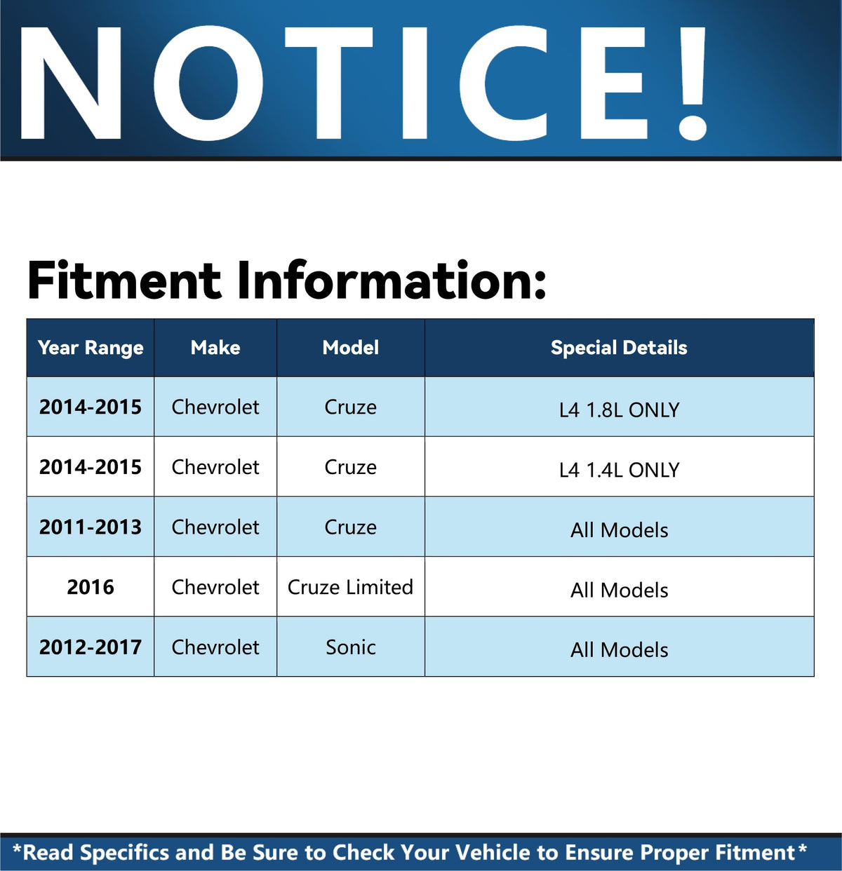 Kit Includes: 2x Front Drilled & Slotted Disc Rotors - S-55185 2x Brake Pad w/Clip Set - P-1522 Fitment: Replacement for 2014-2015 Chevrolet Cruze (L4 1.8L ONLY) Replacement for 2014-2015 Chevrolet Cruze (L4 1.4L ONLY) Replacement for 2011-2013 Chevrolet Cruze Replacement for 2016 Chevrolet Cruze Limited Replacement for 2012-2017 Chevrolet Sonic Detroit Axle brake rotors and pads are manufactured to original equipment standards and provide a superior stopping performance. We are a leading supplier of ride control products to OE vehicle manufacturers Nationwide, that expertise translates to Detroit Axle's OE-quality Aftermarket.