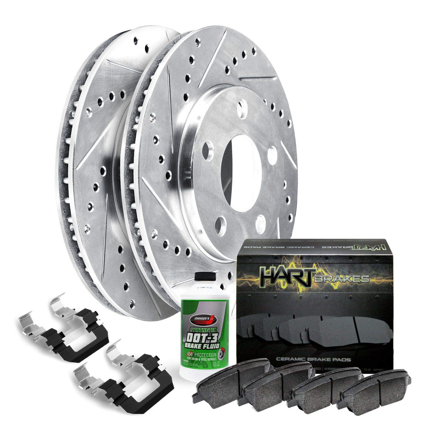 KIT INCLUDES 4 CERAMIC BRAKE PADS AND 2 PERFORMANCE BRAKE ROTORS - This brake kit includes everything you need for a complete brake job. | LESS HEAT LONGER BRAKE LIFE - Hart Brakes drilled rotor will vent hot gasses from the pad surface, reducing heat transfer between the pad and rotor. This allows your brakes to stay cooler under extreme conditions without sacrificing performance. | REDUCE YOUR STOPPING DISTANCE - Slots create a stronger pad bite, reducing your stopping distance providing you best in class braking power. | Quiet Braking - Hart Brakes pads are designed to reduce noise and vibration. The brake pads are shimmed to eliminate noise and absorb vibration, giving you a smoother and quieter ride. | EASY INSTALLATION: Hart Brake Kits come complete with all the necessary hardware for a hassle free installation.