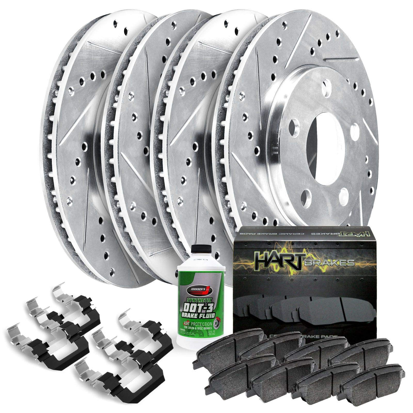 KIT INCLUDES 8 CERAMIC BRAKE PADS AND 4 PERFORMANCE BRAKE ROTORS - This brake kit includes everything you need for a complete brake job. | LESS HEAT LONGER BRAKE LIFE - Hart Brakes drilled rotor will vent hot gasses from the pad surface, reducing heat transfer between the pad and rotor. This allows your brakes to stay cooler under extreme conditions without sacrificing performance. | REDUCE YOUR STOPPING DISTANCE - Slots create a stronger pad bite, reducing your stopping distance providing you best in class braking power. | Quiet Braking - Hart Brakes pads are designed to reduce noise and vibration. The brake pads are shimmed to eliminate noise and absorb vibration, giving you a smoother and quieter ride. | EASY INSTALLATION: Hart Brake Kits come complete with all the necessary hardware for a hassle free installation.