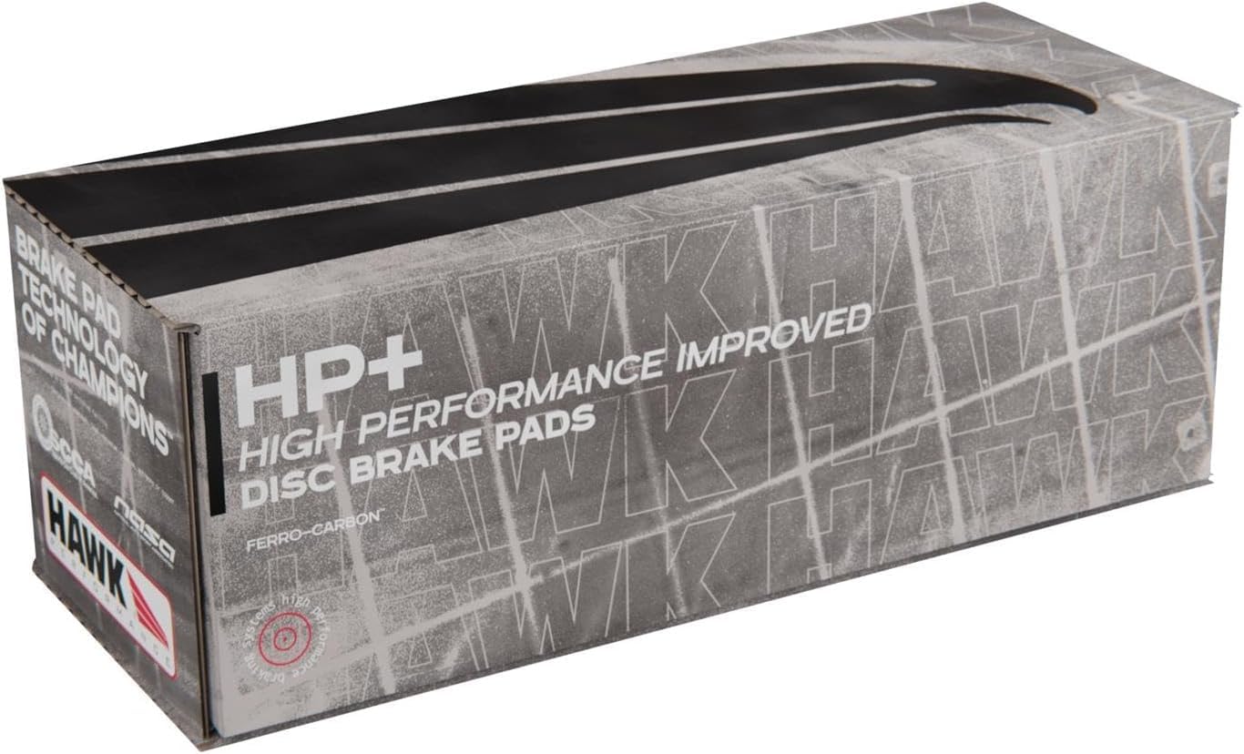 Hawk Performances HP Plus brake pad compound is ideal for Autocross and Track Day drivers looking for a high performance race compound that can take the heat of the track and get you home safely without having to change the pads. HP Plus utilizes a unique Ferro-Carbon, high-tech friction material that was developed and manufactured for sport driving in autocross, Solo II and track day applications. The Ferro-Carbon formulation offers lower wear rates and higher torque values than other competitive materials. Extremely high coefficient of friction makes HP Plus the perfect upgrade over stock for high performance streetcars used in autocross competition or that experience repetitive, heavy braking. Warning: Due to the dramatic friction levels produced by this product to achieve ''race-level'' braking, rotor wear, noise, dust and pad life may be affected. Note: Hawk Performance burnishes its HP Plus brake pads as a final step in the factory, but all brake pads have to be bedded-in with the rotors (new or used) that they will be used against. Properly bedding-in new brake pads results in a transfer film being generated at the pad and rotor interface to maximize brake performance.