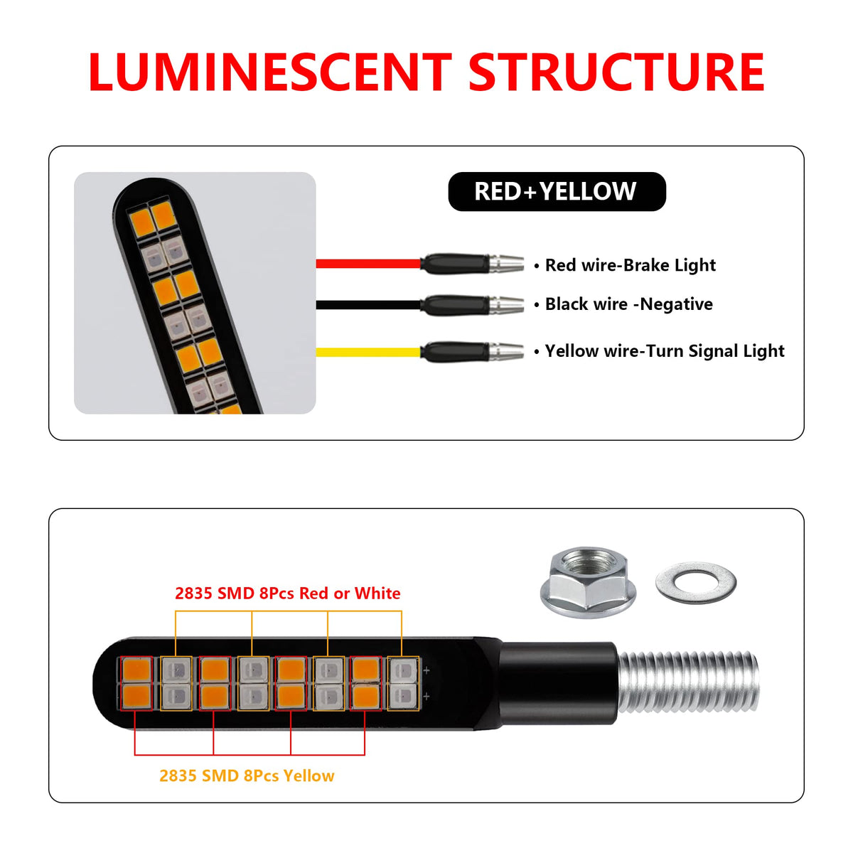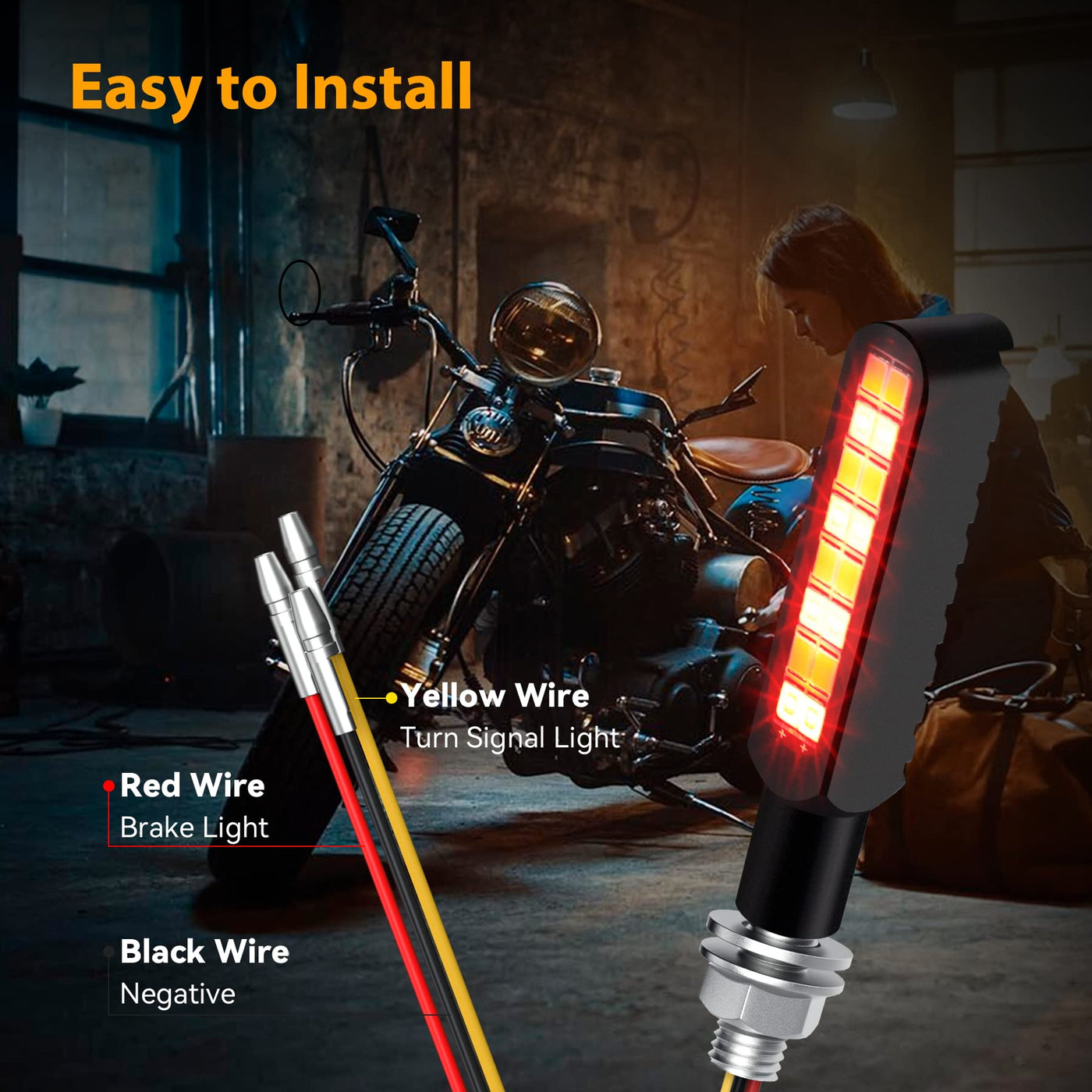 Compatibility: Suitable for most 12V motorcycles. Note: some models require a load resistor or flasher relay when replacing turn signal Light. | High Quality: Our product features an aluminum alloy casing that is wear-resistant, shock-resistant, and easy to dissipate heat | IP67 Protection: Waterproof and dustproof, unaffected by harsh weather conditions, and extends the lifespan of the LED | Easy to Install: Black Wire is Negative, Yellow Wire is Turn Signal Light, Red Wire is Brake Light. Notice: When the Turn Signal is on, the Brake Light will turn off; When the Turn Signal is Turned off, the Brake Light will Returns to its birghtness | Professional Service: We are committed to providing good customer experience, if you have any questions about our product, please do not hesitate to contact us