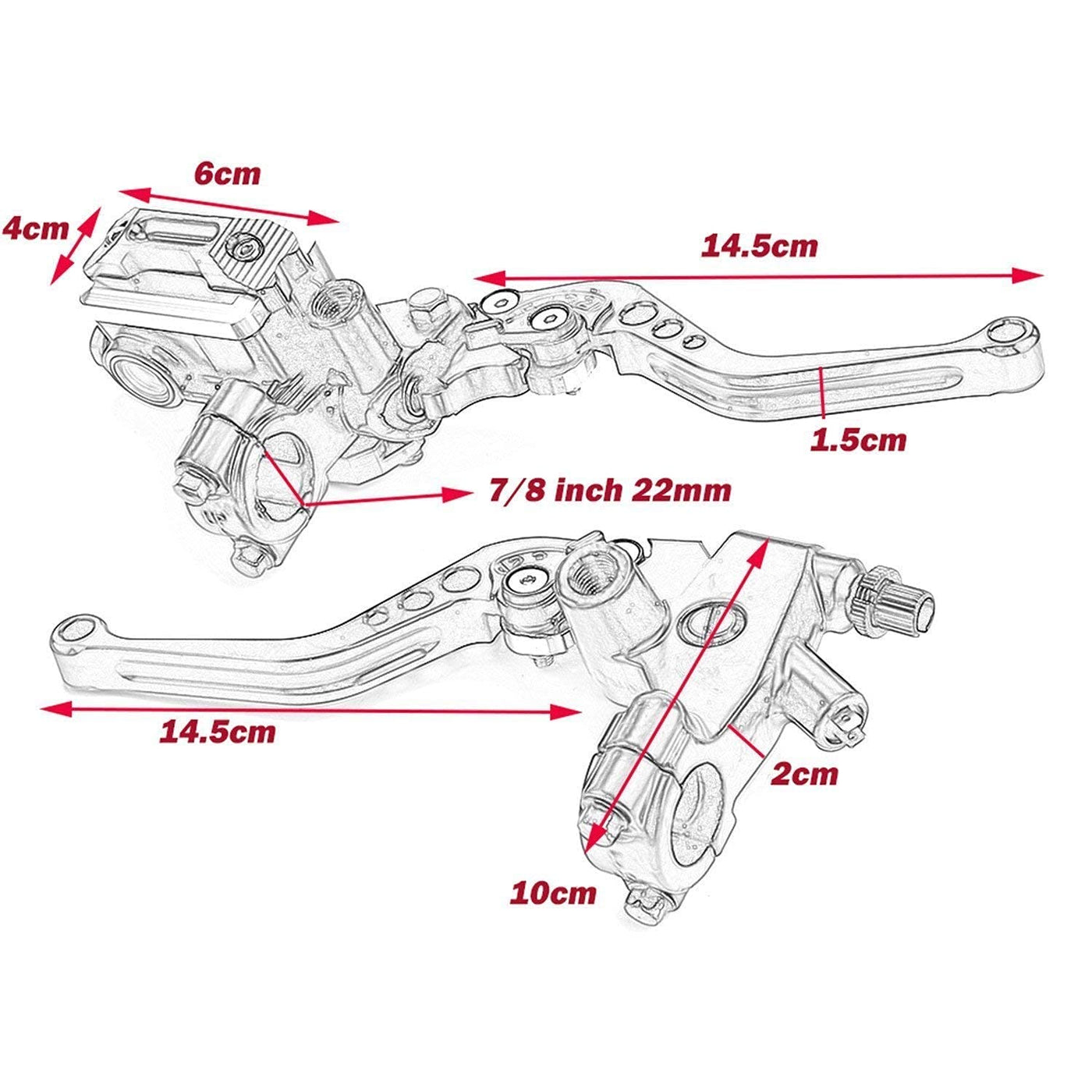 Features: Material: Machined from CNC Billet 6061-T6 Aluminum Enhance the look of your motorcycle with these custom hand Levers Adjustable Design for the Perfect Lever Position. Lever Surface Shape Designed for A Comfortable and Smooth Feel Improves the Sensitivity of Your Brake for Stopping Power and Driving Safety The pivot design allows the lever to fold outward to prevent bending or breaking in the event of a crash Easy installation! These Levers are great replacement for your old Levers Fitment: Universal fitment Hydraulic Brake lever and Cable Clutch lever, fit on most brand 125c.c. to 400 c.c. Sport bike / Street bike / Scooter / Dirt Bike with 7/8'' (22mm) Standard Handle bar Package Included: 1 pair of motorcycle clutch lever brake lever brake cylinder