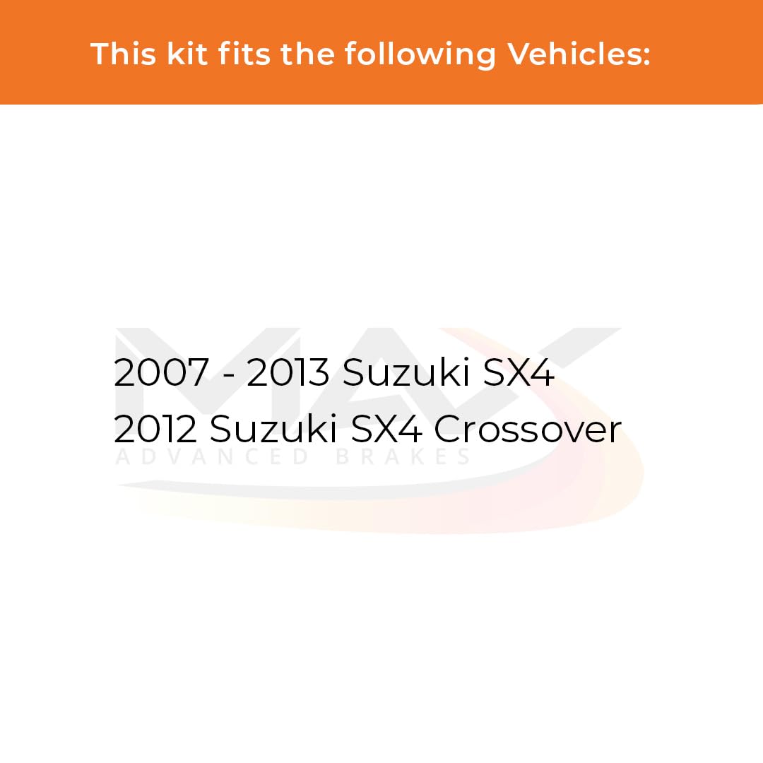 Q: What vehicles are compatible with the Max Advanced Brakes Front Brake Kit?A: The Max Advanced Brakes Front Brake Kit is specifically designed for the 2007-2013 Suzuki SX4 and the 2012 SX4 Crossover. It is essential to verify your vehicle's details, including Year, Model, and Engine Size, to ensure proper fitment.