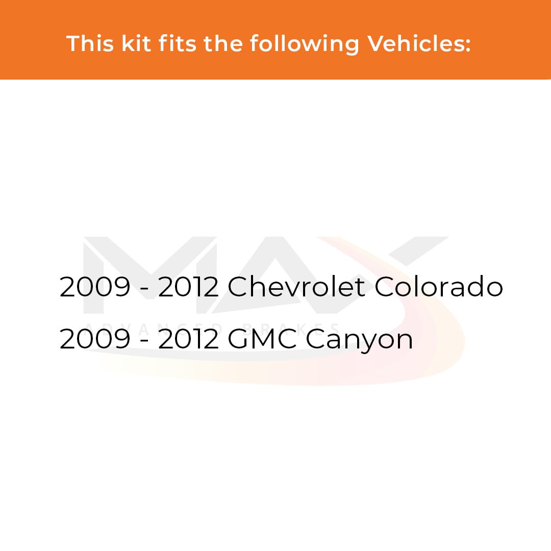 Q: What vehicles are compatible with the Max Advanced Brakes Front Brake Kit?A: The Max Advanced Brakes Front Brake Kit is compatible with 2009, 2010, 2011, and 2012 Chevy Colorado and GMC Canyon models. To ensure a perfect fit, please confirm your vehicle's specifications including Year, Model, Sub-Model, Engine Size, and more during the ordering process.