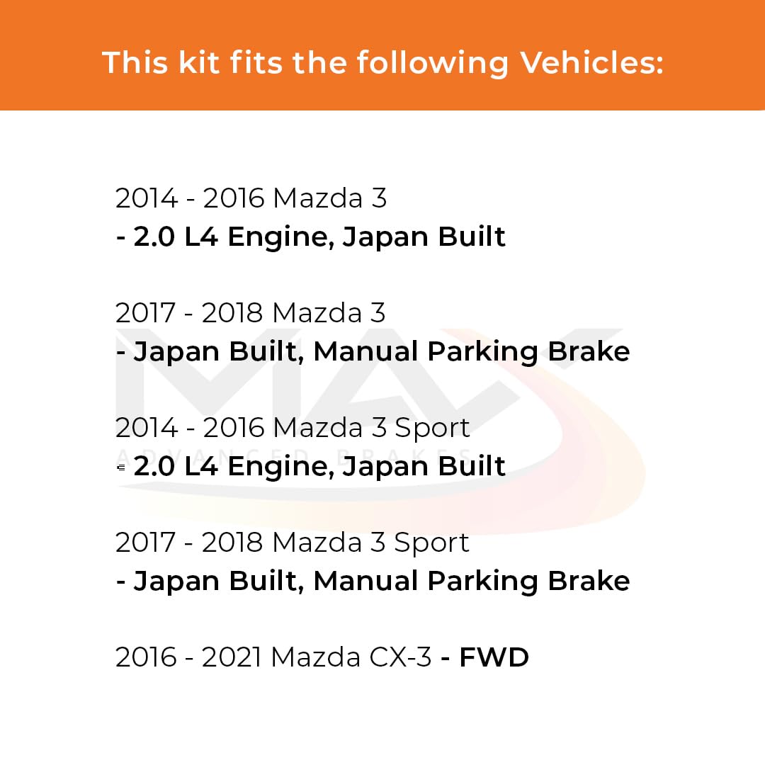 Q: What vehicles are compatible with the Max Advanced Brakes Front Brake Kit?A: The Max Advanced Brakes Front Brake Kit is compatible with 2014-2022 Mazda 3/Sport 2.0 L4 and CX-3 models. It's important to verify the vehicle's year, model, sub-model, engine size, and other specifications before purchasing to ensure proper fitment.