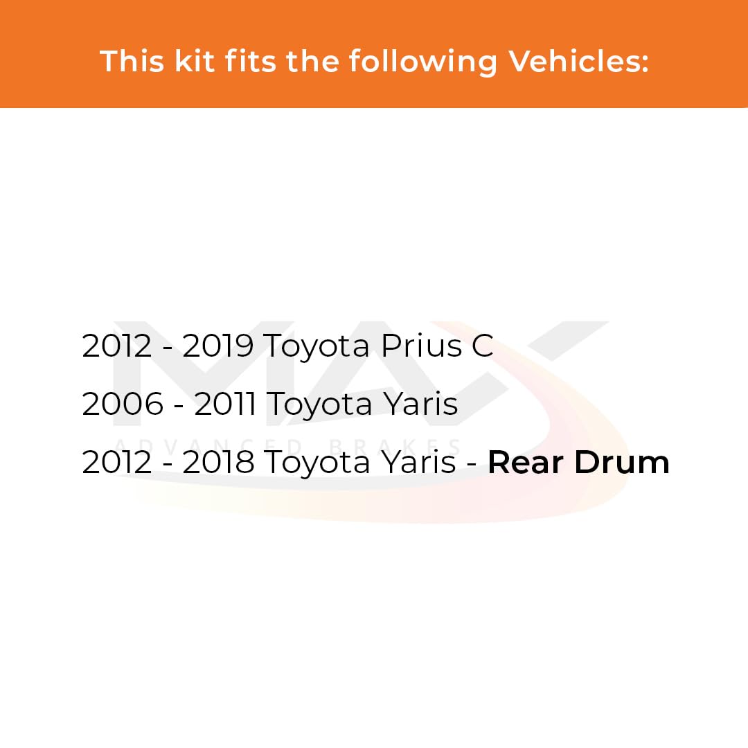 Q: What vehicles are compatible with the Max Advanced Brakes Front Brake Kit?A: The Max Advanced Brakes Front Brake Kit is designed for a perfect fit with Toyota Yaris models from 2006 to 2018 and Prius C models from 2012 to 2019. To ensure compatibility, please verify your vehicle's details, including year, model, and sub-model before ordering.