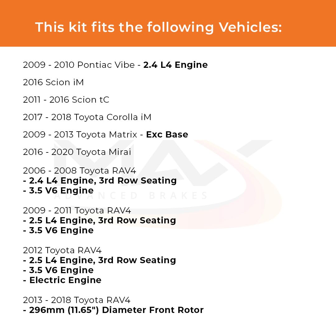 Q: What vehicles are compatible with the Max Advanced Brakes Front Brake Kit?A: The Max Advanced Brakes Front Brake Kit is compatible with the 2006-2018 Toyota RAV4 with 3rd Row Seating, as well as other models including 2016-2020 Mirai, 2017-2018 Corolla iM, 2009-2013 Matrix, 2009-2010 Pontiac Vibe, 2016 Scion iM, and 2011-2016 Scion tC. It's essential to verify your specific vehicle details to ensure proper fitment.