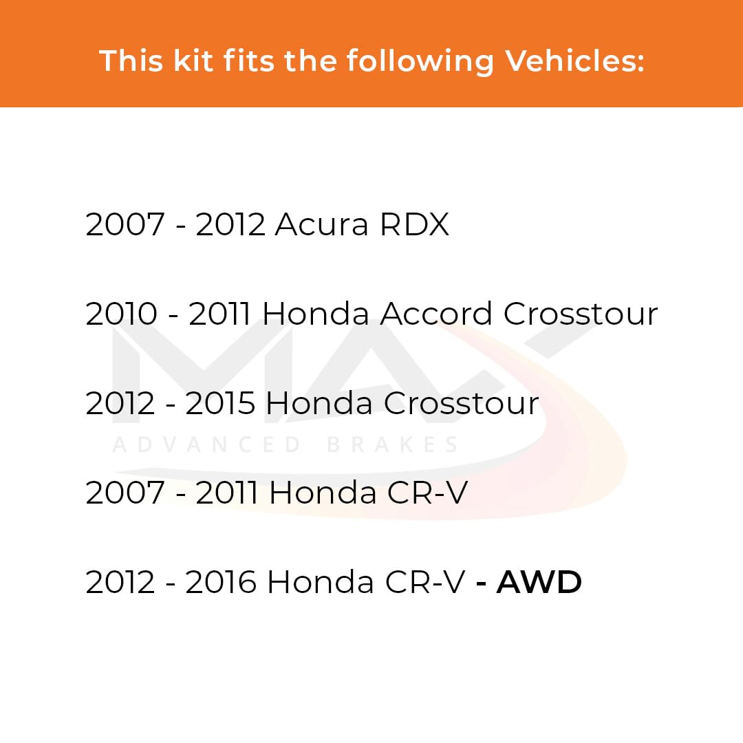 Q: What vehicles are compatible with the Max Advanced Brakes Front Brake Kit?A: The Max Advanced Brakes Front Brake Kit is compatible with 2007-2016 Honda CR-V models, 2012-2015 Honda Crosstour, and 2007-2012 Acura RDX. It is essential to verify your vehicle's year, model, sub-model, and specifications for a guaranteed fit.