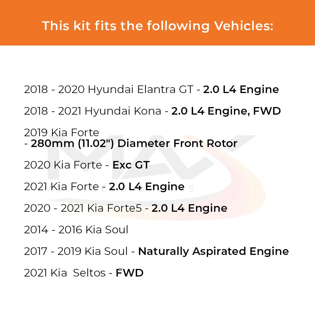 Q: What vehicles are compatible with the Max Advanced Brakes Front Brake Kit?A: The Max Advanced Brakes Front Brake Kit is designed to fit a variety of vehicles, including the 2018-2020 Hyundai Elantra GT, 2019-2021 Hyundai Kona, 2019-2021 Kia Forte, and the 2014-2019 Kia Soul. For the best fitment, please verify specific details such as Year, Model, Sub-Model, and Engine Size during the ordering process.