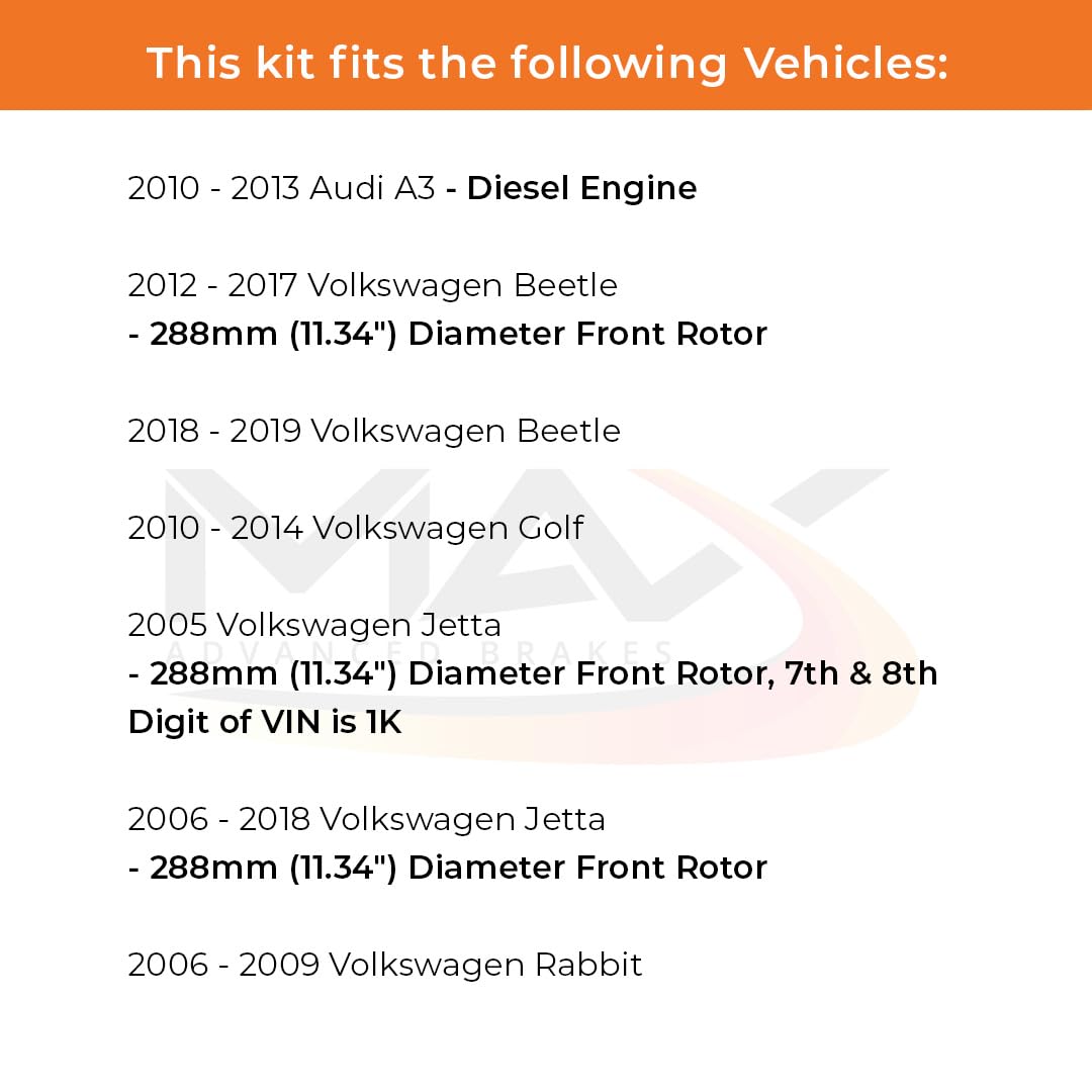 Q: What vehicles are compatible with the Max Advanced Brakes Front Brake Kit?A: The Max Advanced Brakes Front Brake Kit is designed to fit various Volkswagen and Audi models, including the 2005 to 2018 Volkswagen Jetta, Beetle, Golf, Rabbit, and Audi A3. It's essential to verify your vehicle's specific details, such as year, model, and engine size, for a perfect fit.