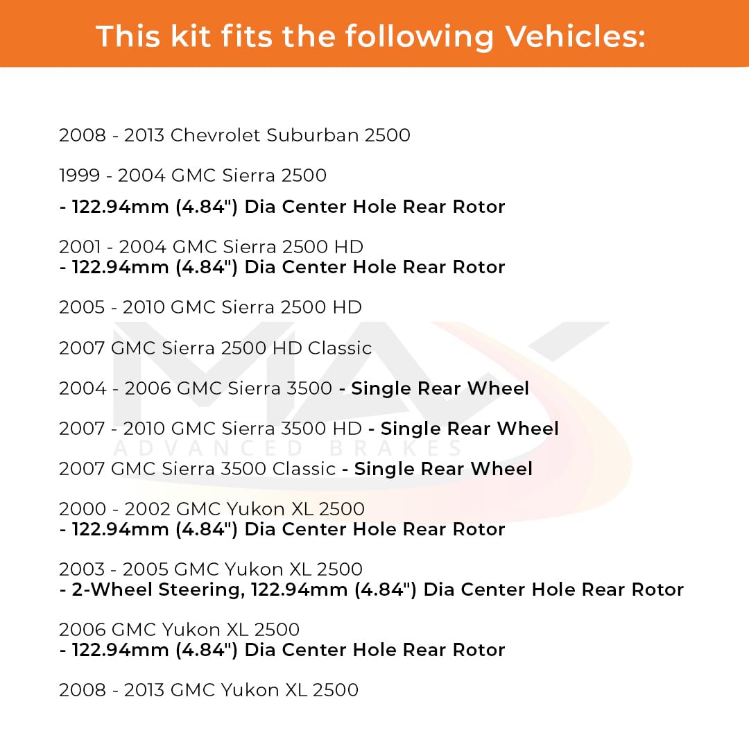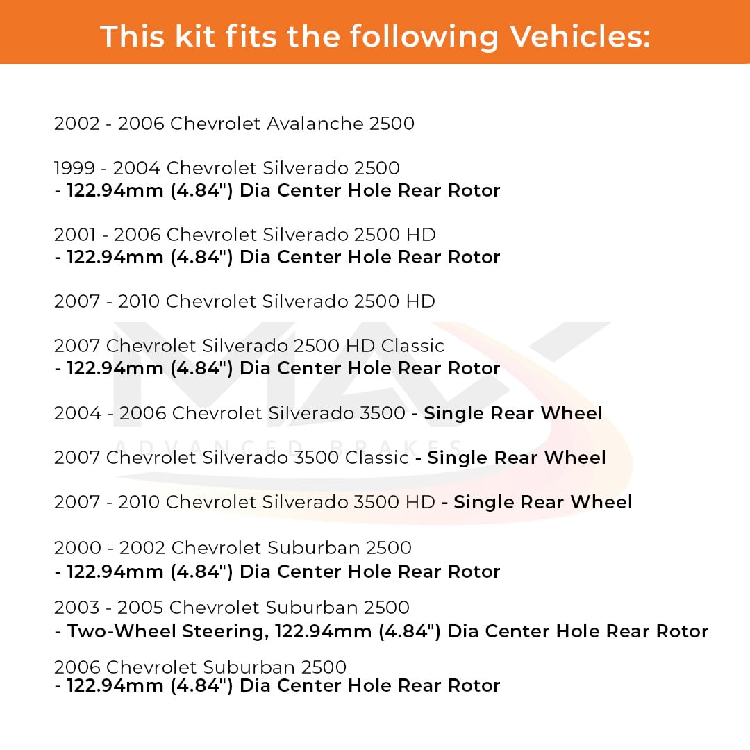 Q: What vehicles are compatible with the Max Advanced Brakes Front & Rear Brake Kit?A: The Max Advanced Brakes Front & Rear Brake Kit is compatible with 2002-2006 Chevrolet Avalanche 2500, 1999-2004 Chevrolet Silverado 2500, GMC Sierra 2500, 2004-2006 Chevrolet Silverado 3500, and GMC Sierra 3500 with a 4.84" diameter center hole rear rotor.