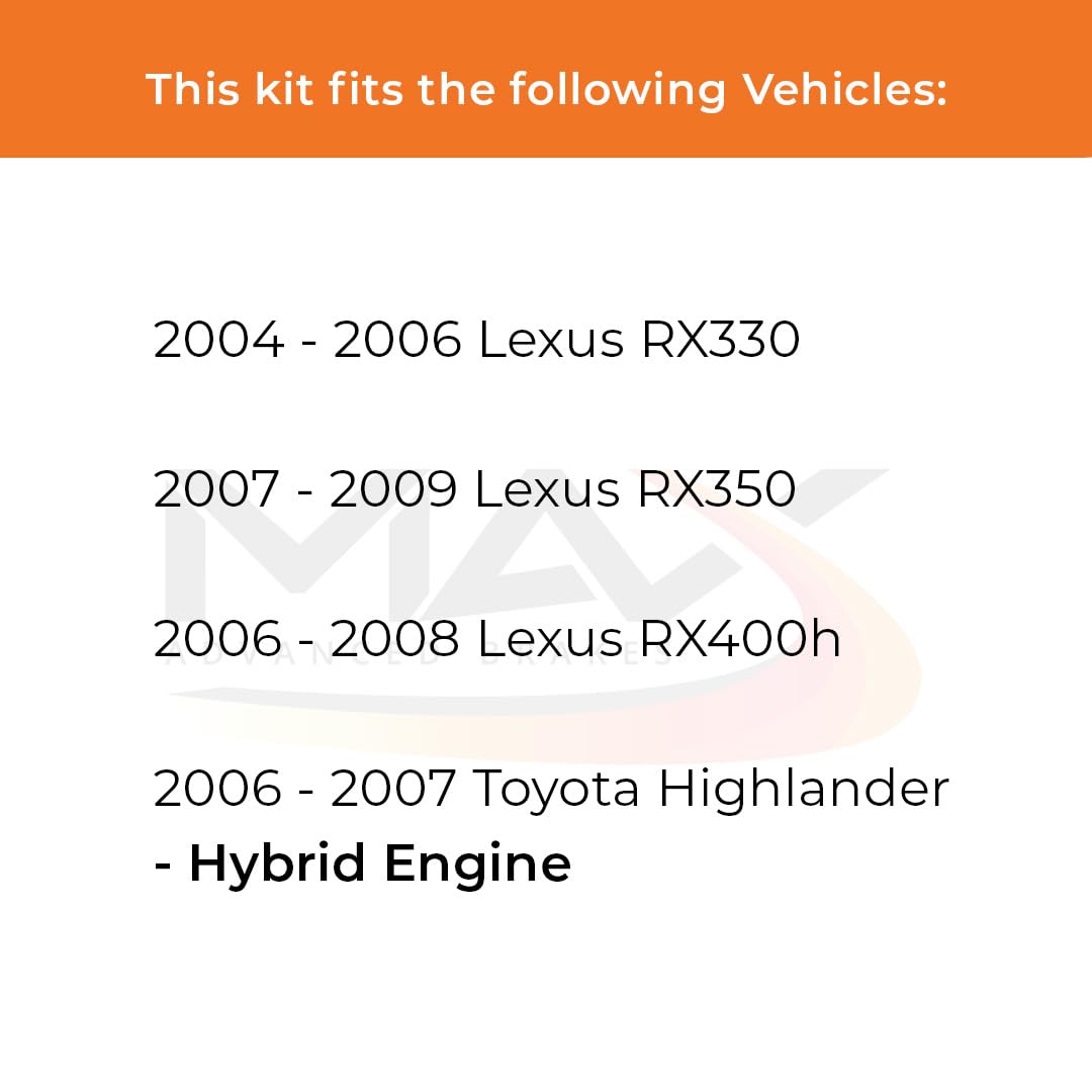Q: What vehicles are compatible with the Max Advanced Brakes Front & Rear Brake Kit?A: This brake kit is specifically designed for the 2004-2006 Lexus RX330, 2007-2009 RX350, 2006-2008 RX400h, and the 2006-2007 Toyota Highlander Hybrid. To ensure proper fitment, please verify your vehicle's details including Year, Model, and VIN#.