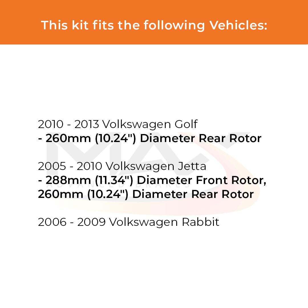 Q: What vehicles are compatible with the Max Advanced Brakes Front & Rear Brake Kit?A: The Max Advanced Brakes Front & Rear Brake Kit is compatible with 2005-2010 Volkswagen Jetta, 2010-2013 Volkswagen Golf, and 2006-2009 Volkswagen Rabbit. It's essential to verify your vehicle's specifications, including year, model, and engine size, to ensure compatibility.