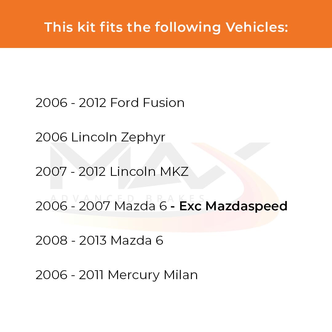 Q: What vehicles are compatible with the Max Advanced Brakes Front & Rear Brake Kit?A: The Max Advanced Brakes Front & Rear Brake Kit is designed to be compatible with the 2006-2012 Ford Fusion, 2007-2012 Lincoln MKZ, 2006-2013 Mazda 6, and 2006-2011 Mercury Milan. To ensure a perfect fit, please verify your vehicle's details including Year, Model, Sub-Model, and Engine Size during the ordering process.