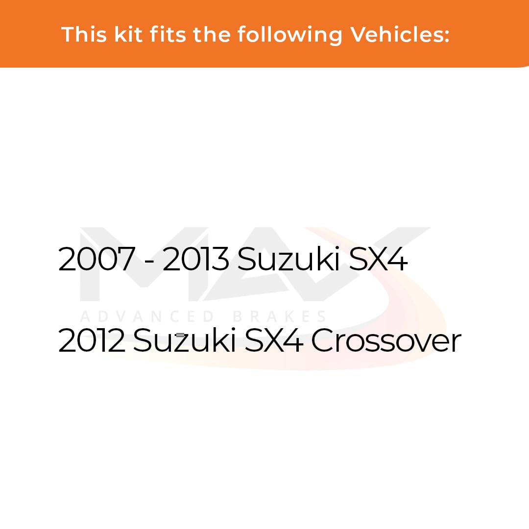 Q: What vehicles are compatible with the Max Advanced Brakes Front & Rear Brake Kit?A: The Max Advanced Brakes Front & Rear Brake Kit is specifically designed for the 2007 to 2013 Suzuki SX4 models, including the 2012 SX4 Crossover. To ensure a perfect fit, customers should verify their vehicle's details during the ordering process.