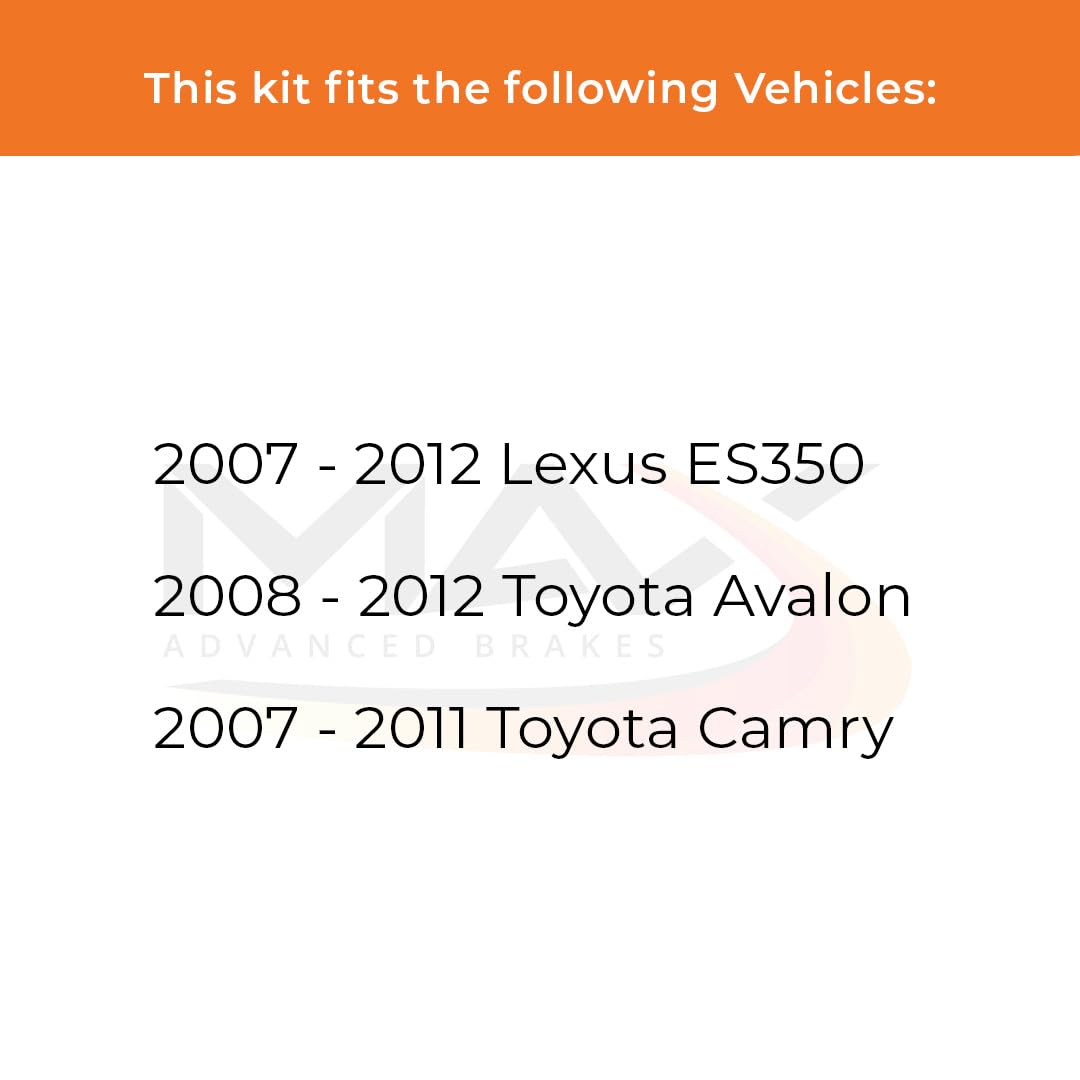 Q: What vehicles are compatible with the Max Advanced Brakes Front & Rear Brake Kit?A: The Max Advanced Brakes Front & Rear Brake Kit is compatible with 2007-2012 Lexus ES350, 2008-2012 Toyota Avalon, and 2007-2011 Toyota Camry. It's important to verify your vehicle's details, such as Year, Model, and Engine Size, to ensure a proper fit.