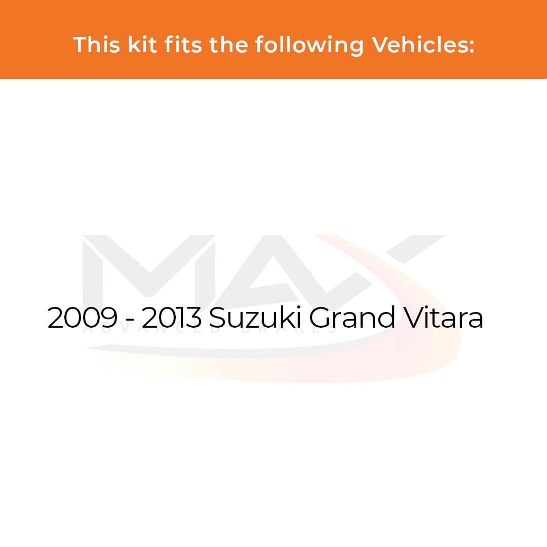 Q: What vehicles are compatible with the Max Advanced Brakes Front & Rear Brake Kit?A: The Max Advanced Brakes Front & Rear Brake Kit is specifically designed to fit 2009, 2010, 2011, 2012, and 2013 Suzuki Grand Vitara models. To ensure compatibility, please verify your vehicle's details, including Year, Model, and other specifications before purchasing.