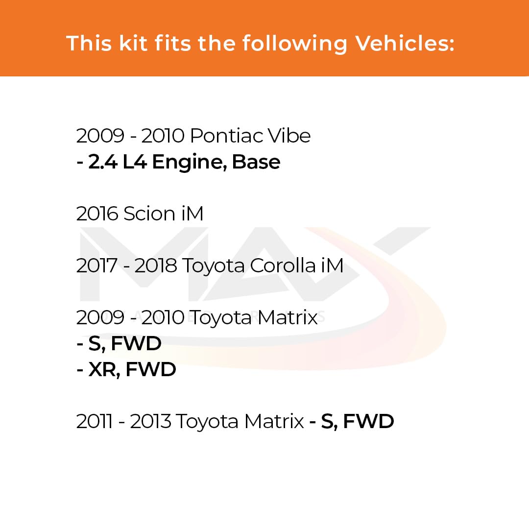 Q: What vehicles are compatible with the Max Advanced Brakes Front & Rear Brake Kit?A: The Max Advanced Brakes Front & Rear Brake Kit is designed to fit various models, including the 2009 and 2010 Pontiac Vibe, 2016 Scion iM, 2017 and 2018 Toyota Corolla iM, and the 2009 to 2013 Matrix models. For the best results, please confirm your vehicle's specifications such as Year, Model, and Engine Size before purchasing.