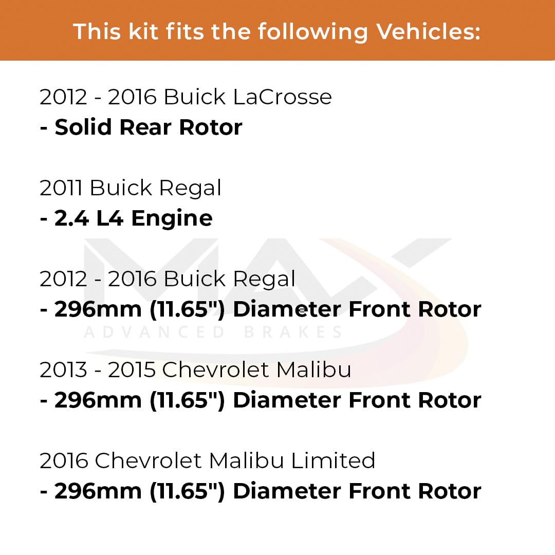 Q: What vehicles are compatible with the Max Advanced Brakes Front & Rear Brake Kit?A: This brake kit is designed to fit 2013-2015 Chevrolet Malibu, 2012-2016 Buick LaCrosse, and 2011-2016 Buick Regal equipped with 11.65" diameter front rotors. Always verify your vehicle's details before ordering to ensure compatibility.